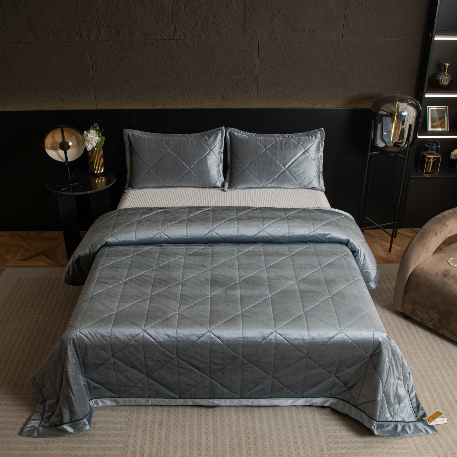 Геометрический узор на покрывале выполнен с использованием термостежки, что придаёт изделию особую изысканность и подчёркивает элегантность интерьера.