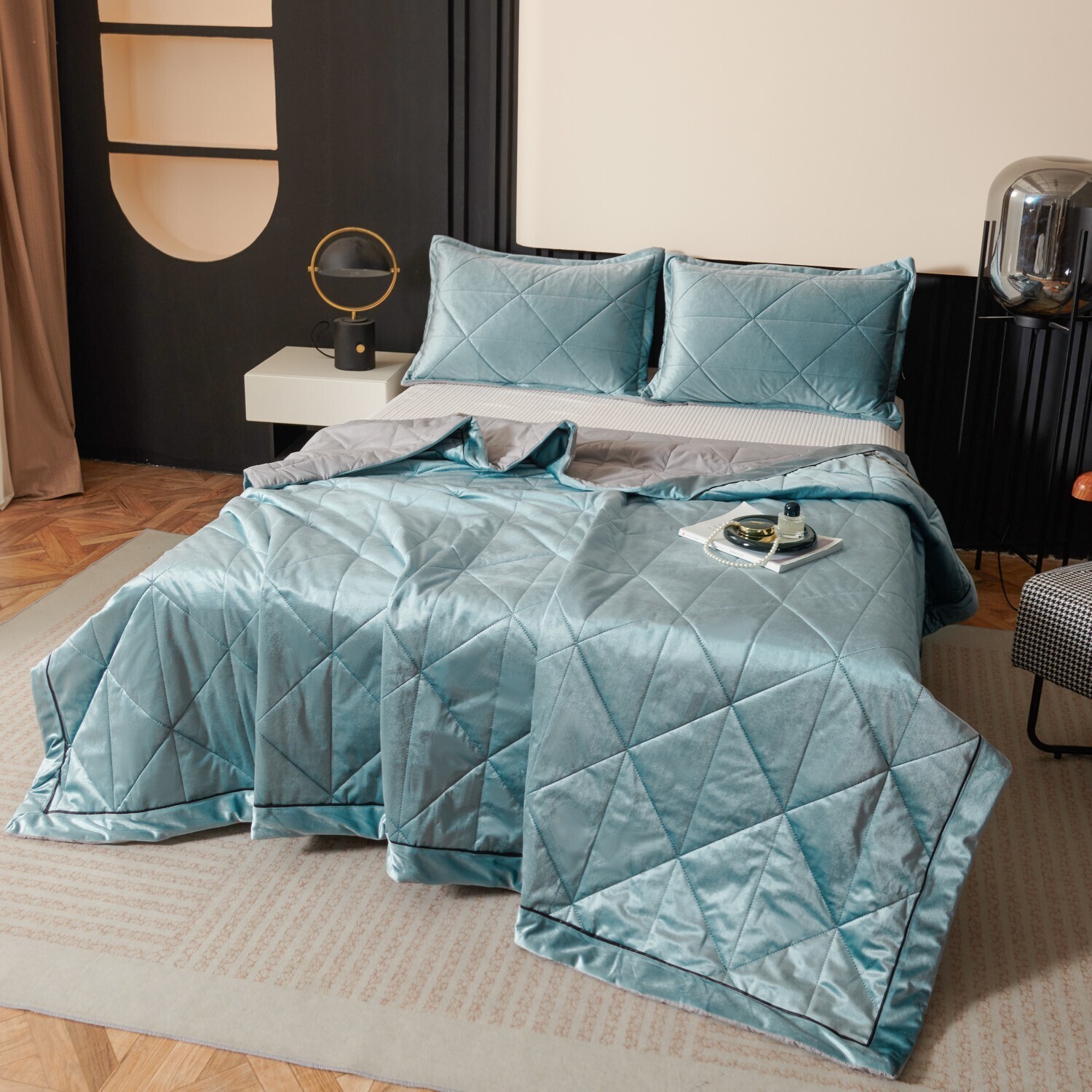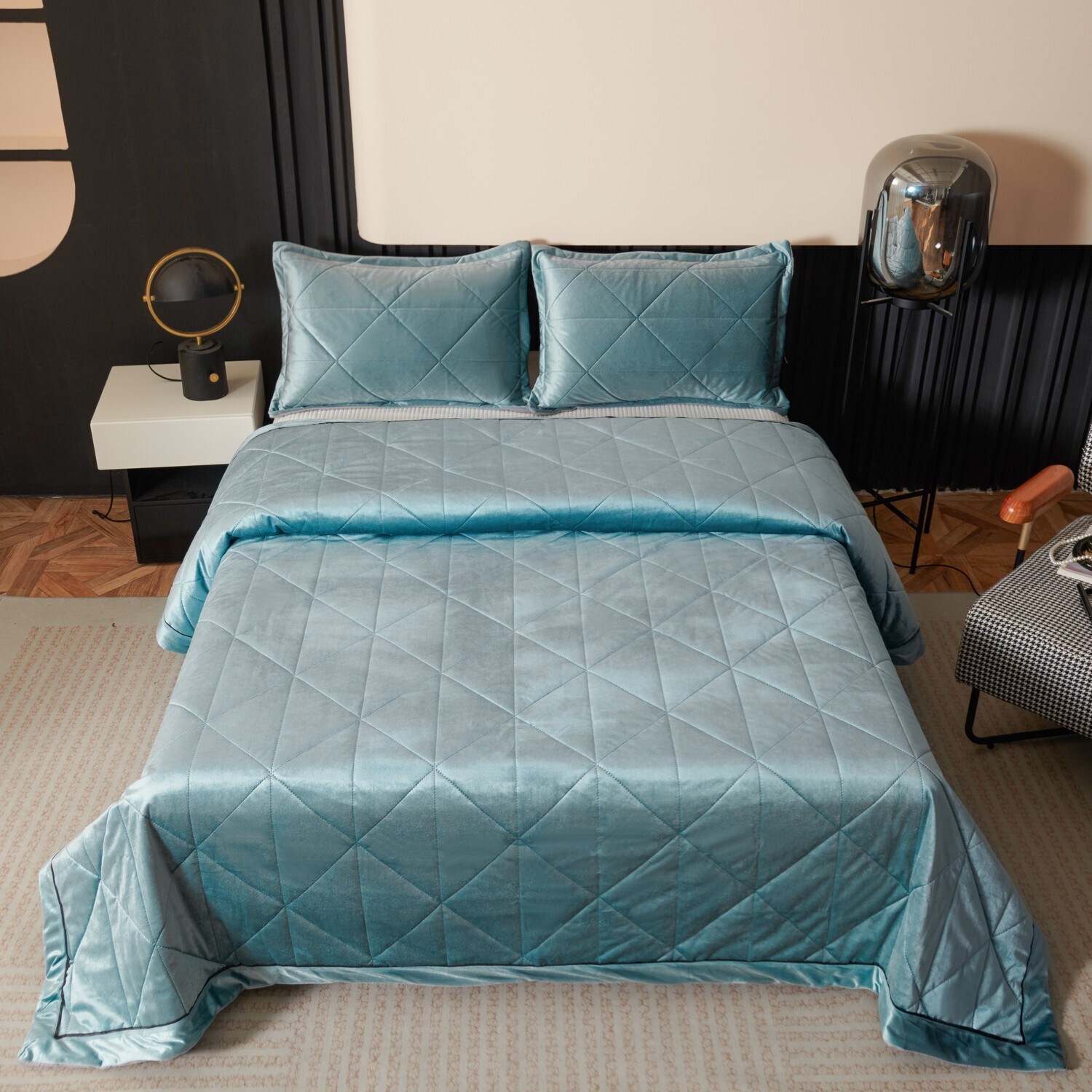 Геометрический узор на покрывале выполнен с использованием термостежки, что придаёт изделию особую изысканность и подчёркивает элегантность интерьера.