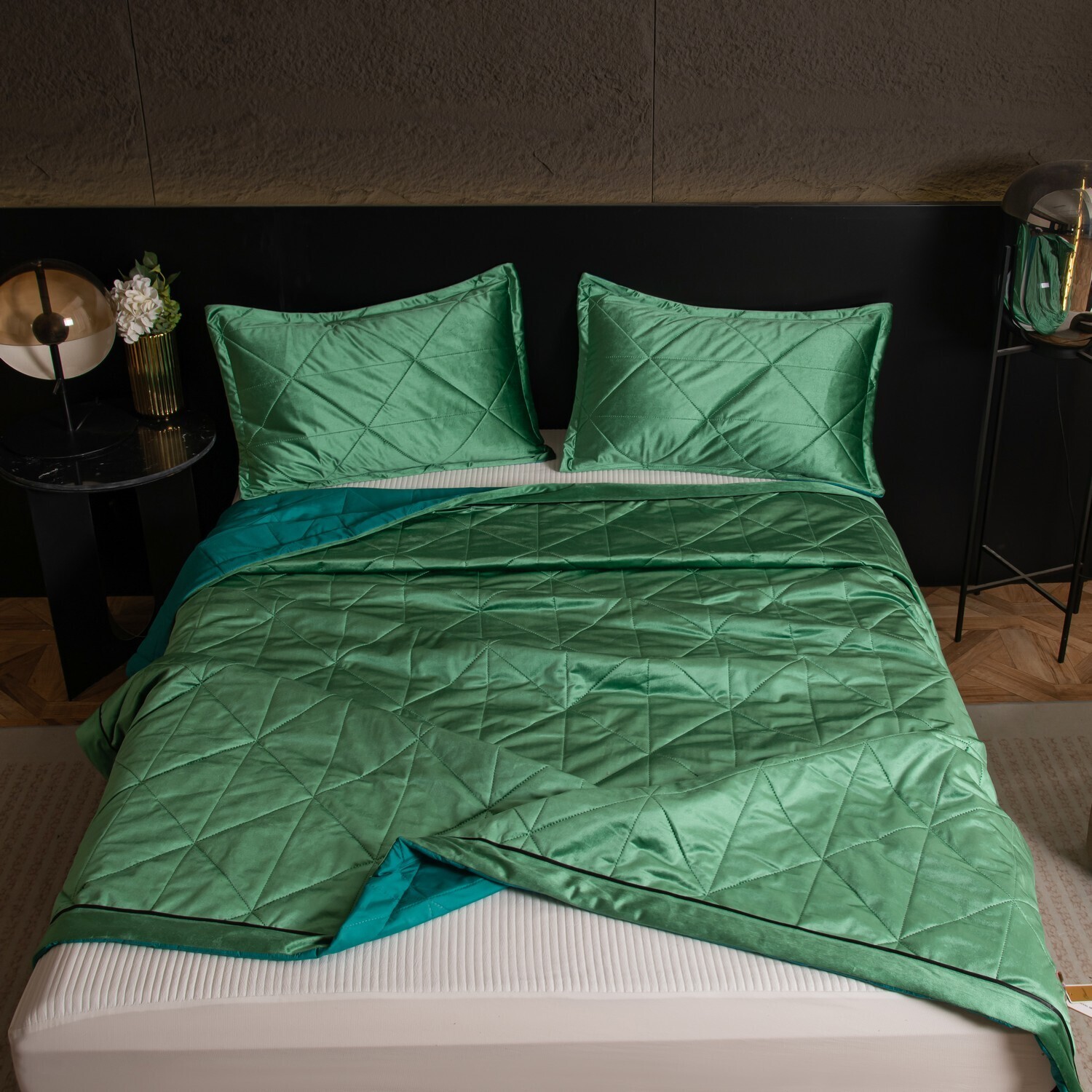 Геометрический узор на покрывале выполнен с использованием термостежки, что придаёт изделию особую изысканность и подчёркивает элегантность интерьера.