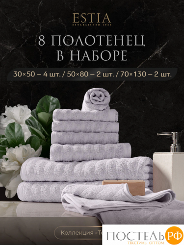 Коллекция полотенец Мартос от бренда ESTIA — сочетание качества, комфорта и элегантности для вашего дома. Набор из 8 полотенец включает 4 полотенца для рук размером 30х50 см, 2 полотенца 50х80 см и 2 больших полотенца 70х130 см, выполненные из высококачественного 100% чесаного хлопка. Мягкая махровая ткань с плотностью 500 г/м2 обеспечивает отличную впитываемость, быстрое высыхание и комфорт при использовании. Полотенца гипоаллергенны и безопасны для чувствительной кожи, что делает их идеальным выбором для всей семьи.