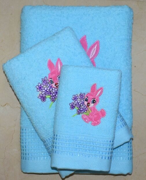 Махровое полотенце "Зайка с сиренью"-ГОЛУБОЙ 70*140 см. хлопок 100%
