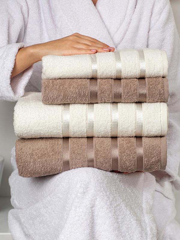 Материал ткани: махровое полотно; Состав: 100% хлопок; Плотность: 400 ± 5 г/м2; Комплектация: В комплекте 4 шт- 50х80 см - 2 шт, 70х130 см - 2 шт; Праздники: Новый год, 8 марта; Тип изделия: полотенца; Цвет: белыйкоричневый; Размер: 50х80 см, 63х145 - 70х135 см