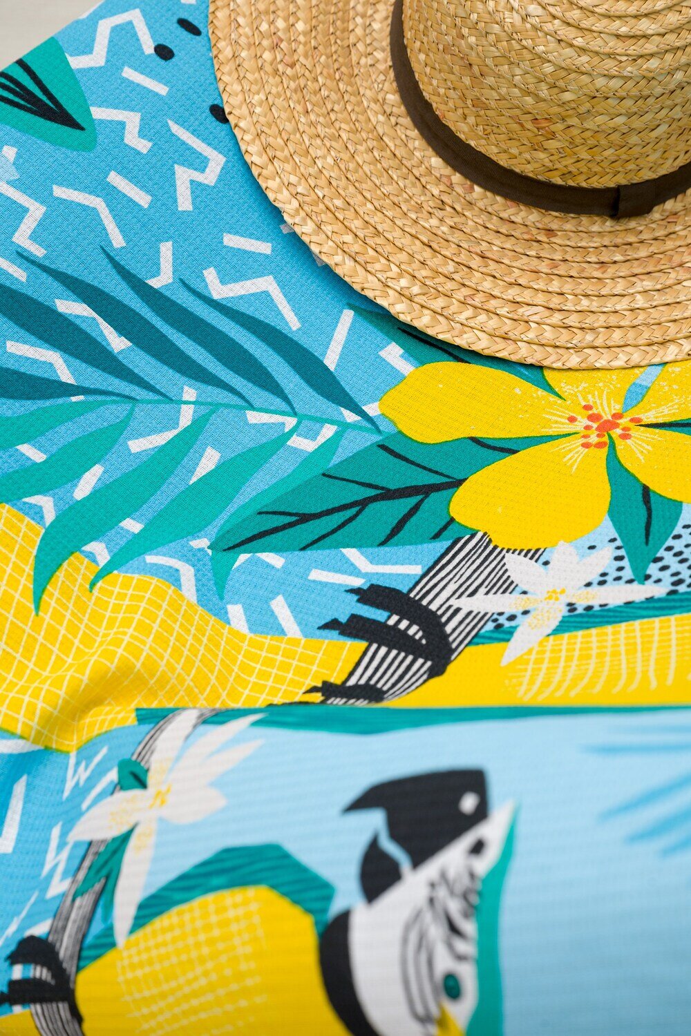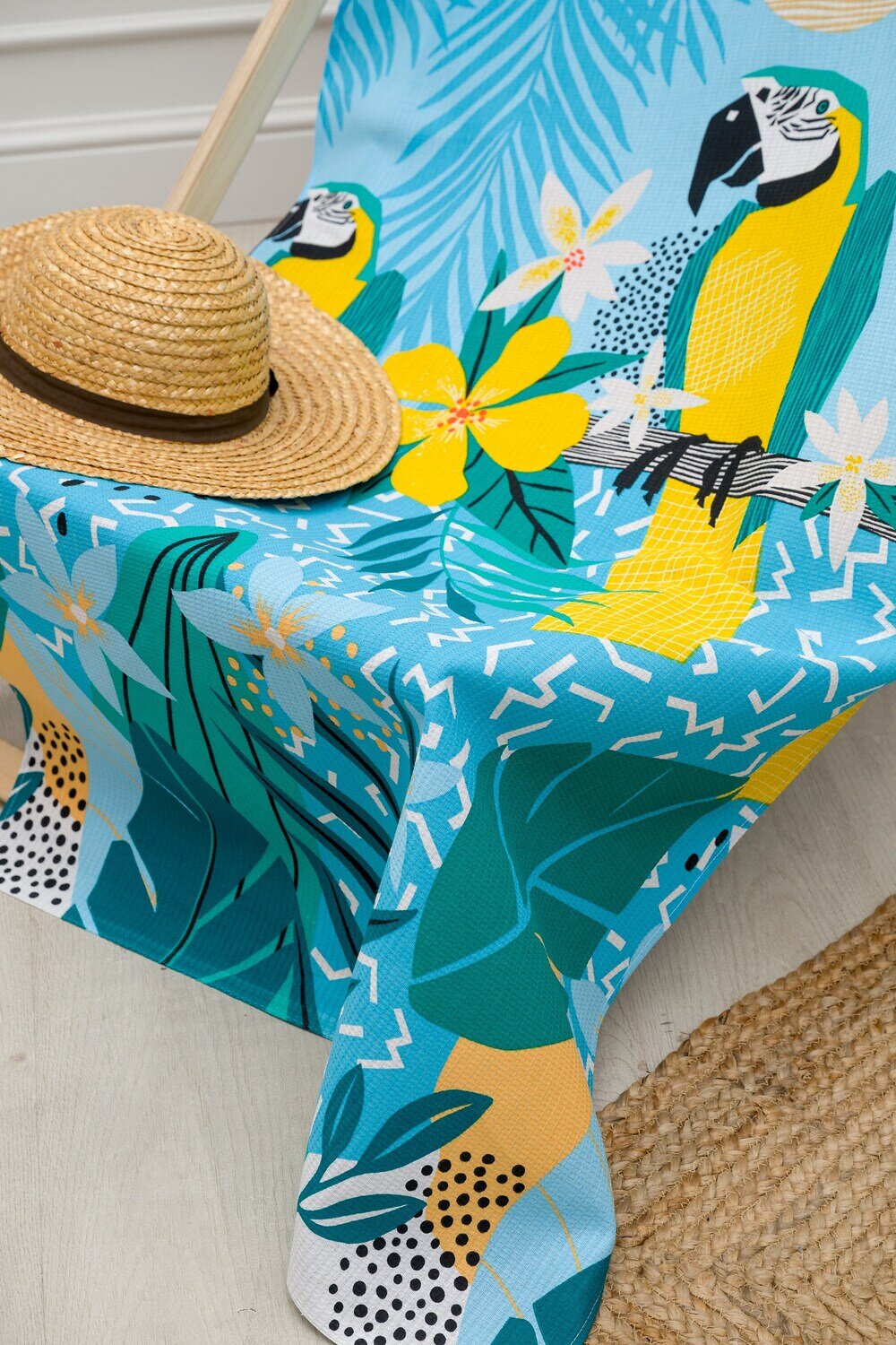 Большое банное полотенце Рандеву, отличное решение для отпуска. Вафельное полотенце с попугаями имеет отличную впитывающую способность, при этом полотенце достаточно компактно, что позволяет его брать с собой. Полотенце универсально, подойдет как для пляжа, бани, сауны, так и для тренировки. Размер полотенца 150*100, по длинной стороне пришита петелька. Изделие представлено в двух цветах, голубой и розовый.