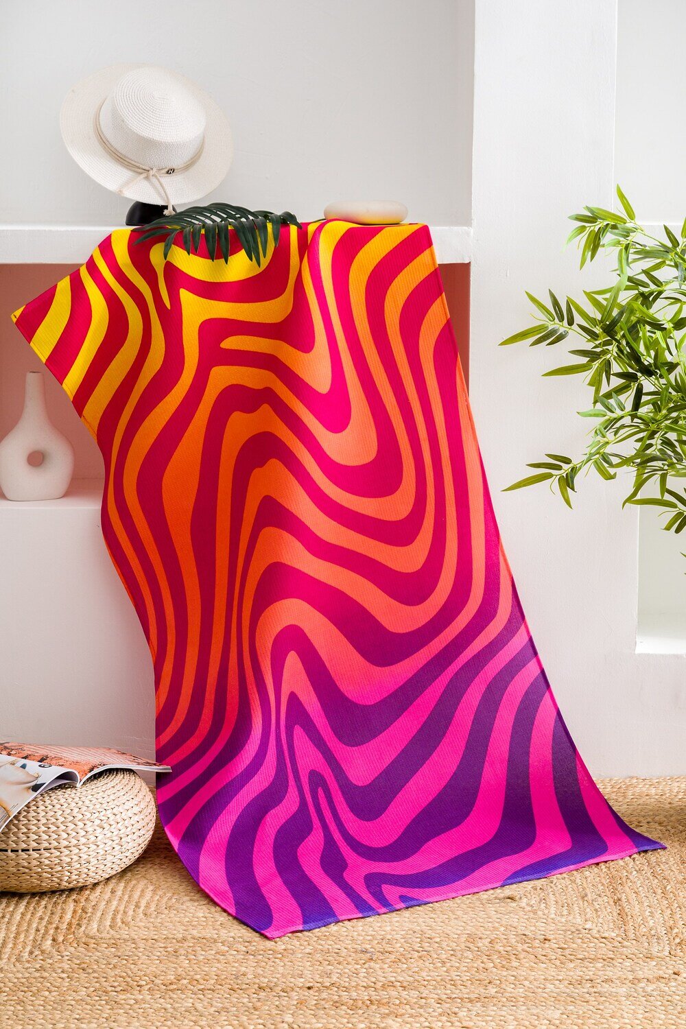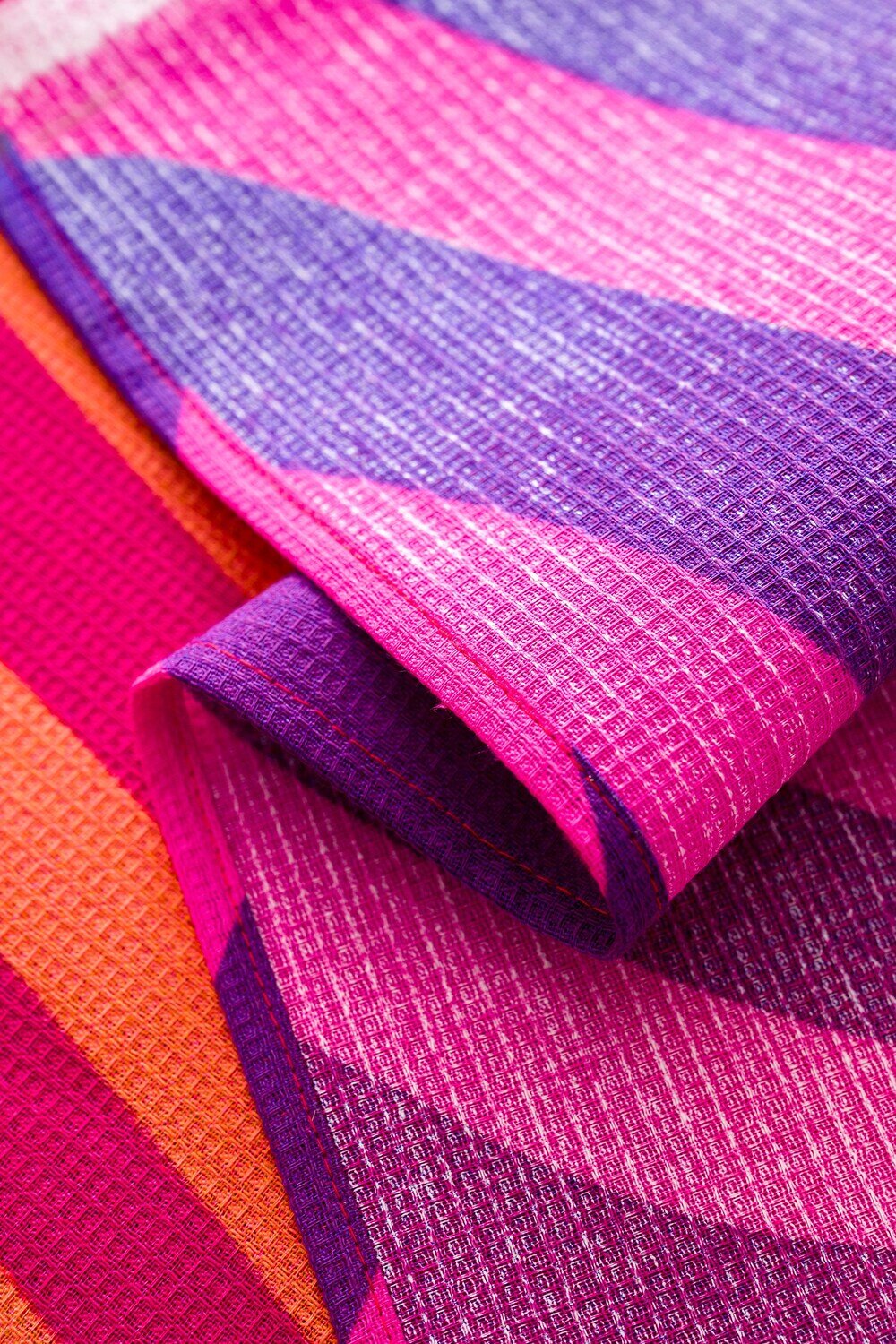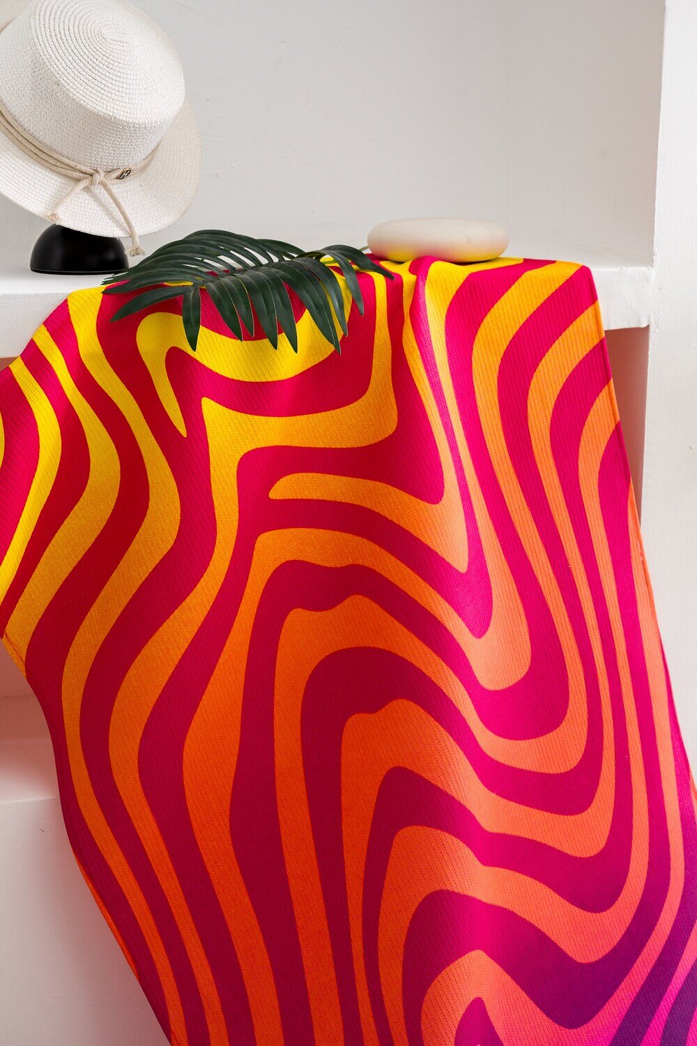 Вафельное полотно обеспечивает отличную впитываемость и быстрое высыхание, что делает его компактным и удобным для путешествий. Наслаждайтесь отпуском на море или на даче, обернувшись в это красно-желтое полотенце с абстрактным узором Волна эмоций.