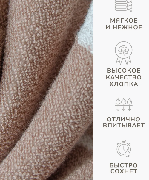 • Простоты ухода. Изделие следует стирать с помощью жидких средств без использования отбеливателей при оптимальной температуре 40 °C (максимальная температура стирки - 60 °C ). Чтобы полотенце радовало вас своей впитываемостью как можно дольше, рекомендуем отказаться от кондиционеров для белья.