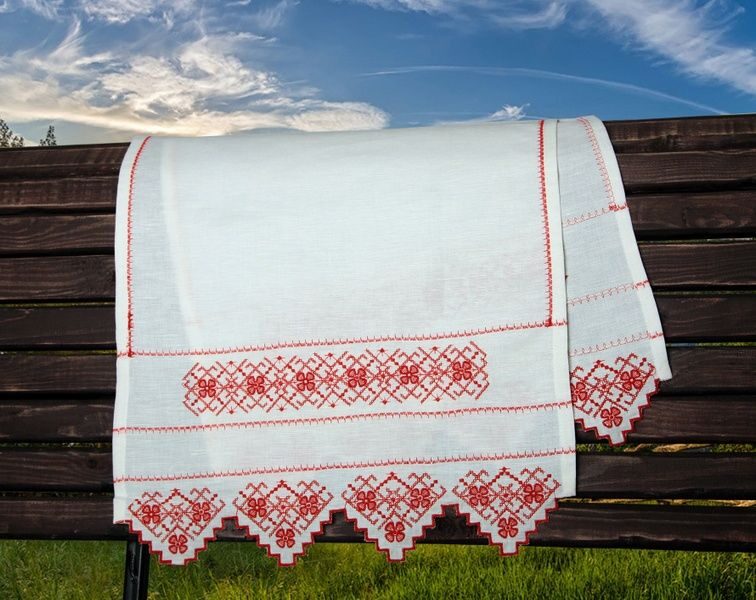 Вышитый льняной рушник в народном стиле не сравнится не с какими заводскими полосками с печатным рисунком. С вышитым рушником не стыдно и каравай держать и молодоженов благословлять. Посмотрите как сочетается рушник на фоне деревенской природы вот, что значит живая вышивка.