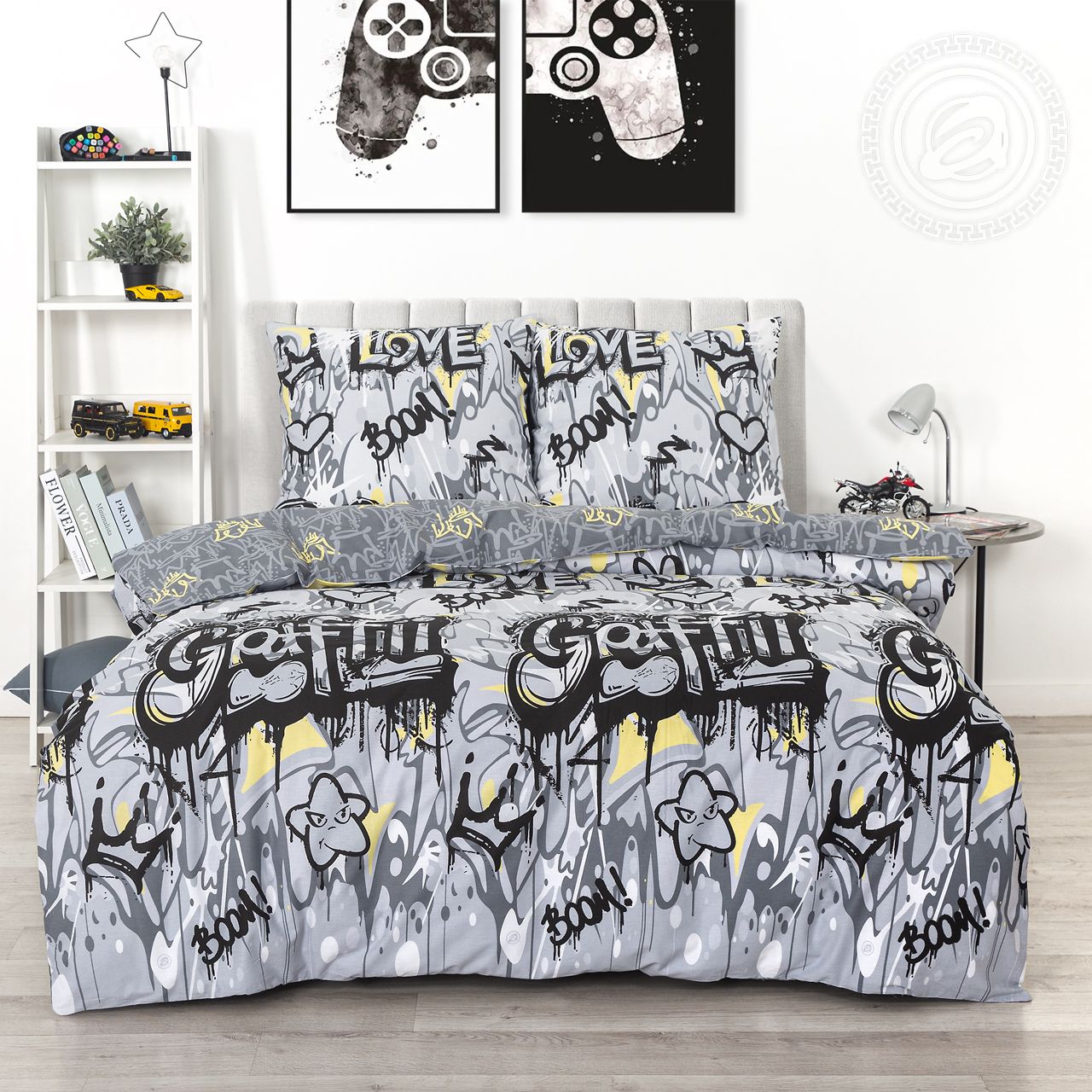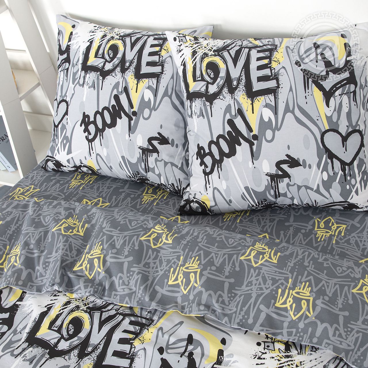 «Стрит-Арт» – дизайн, который показывает характер и выражает индивидуальность! На постельном белье яркий принт в популярных серо-желтых оттенках. Он представляет собой граффити в виде оригинальных надписей и рисунков. Комплект смотрится необычно, современно, трендово.