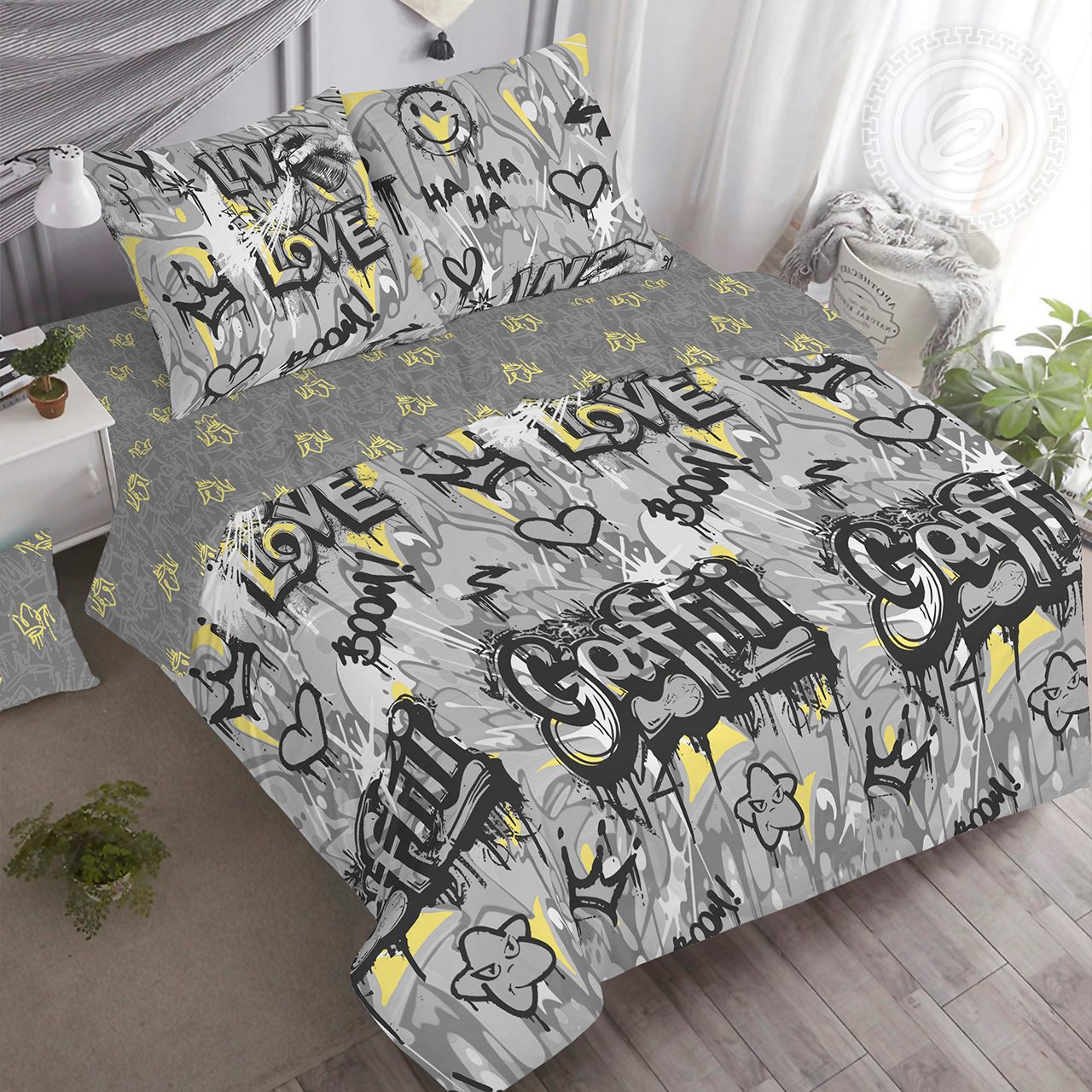 «Стрит-Арт» – дизайн, который показывает характер и выражает индивидуальность! На постельном белье яркий принт в популярных серо-желтых оттенках. Он представляет собой граффити в виде оригинальных надписей и рисунков. Комплект смотрится необычно, современно, трендово.