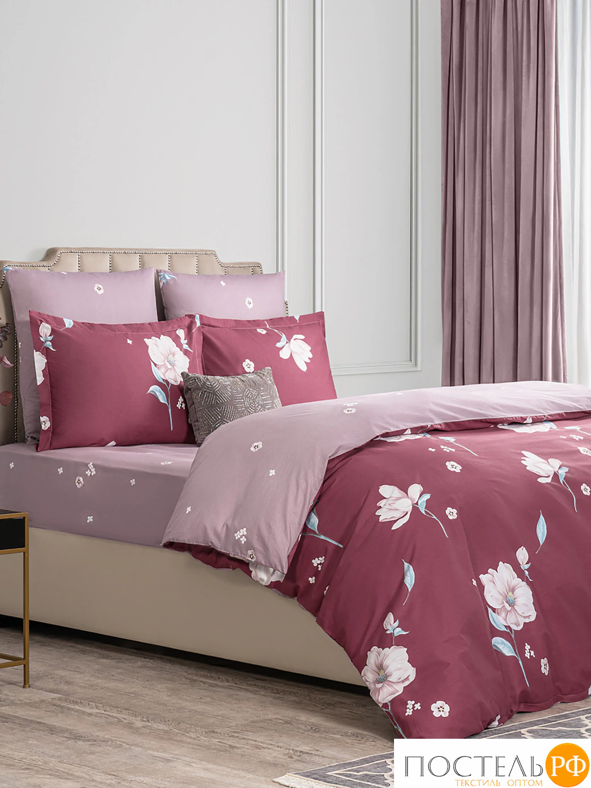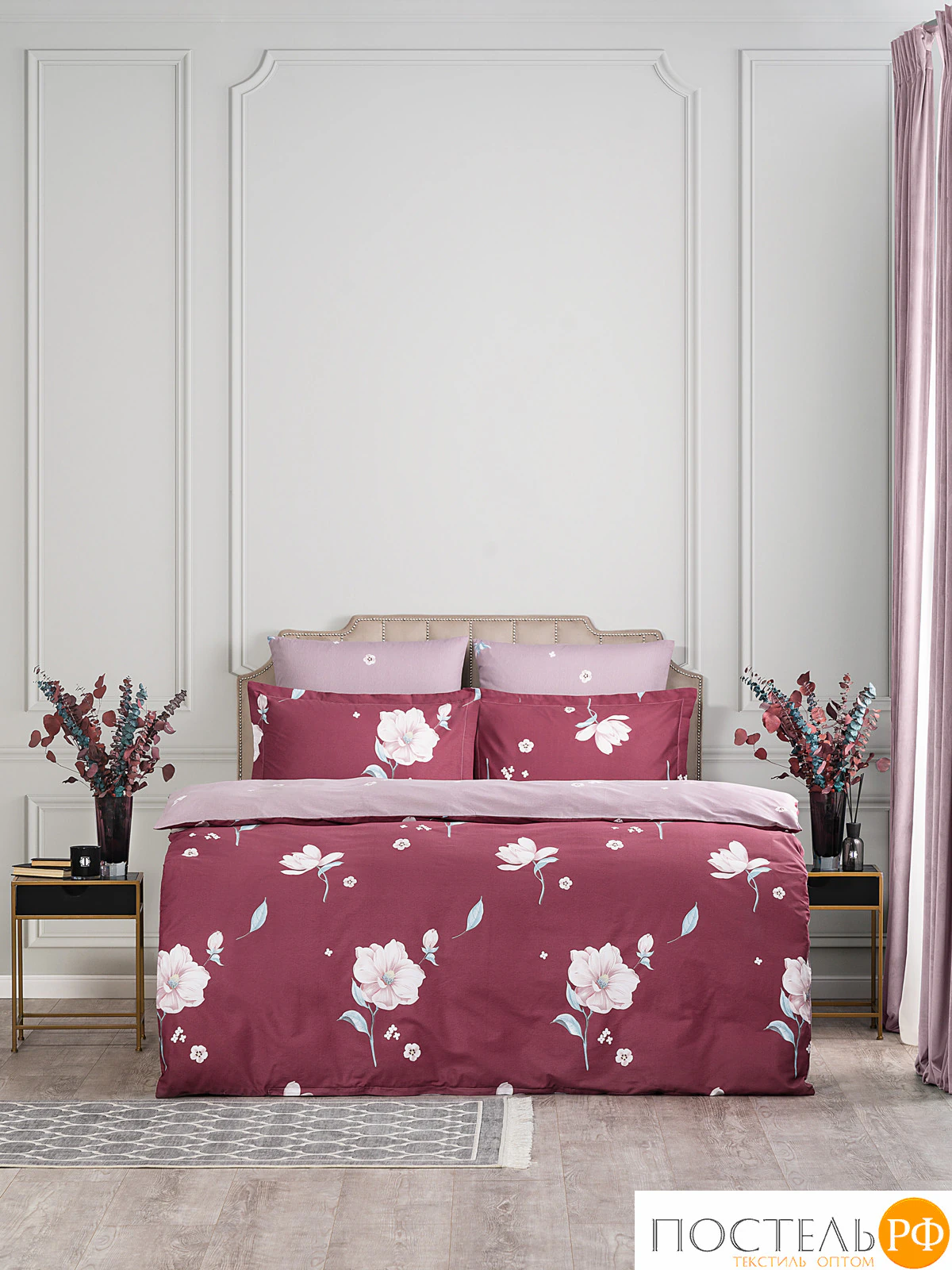 Двусторонний дизайн позволяет легко изменять облик вашей спальни, а застёжка пододеяльника на молнии делает использование комплекта более удобным. Комплект постельного белья очаровывает своим изысканным дизайном: крупные цветы на бордовом фоне гармонично сочетаются с нежным оттенком простыни. Яркие цветочные мотивы добавляют живости и тепла, создавая уютную атмосферу в спальне. Этот комплект идеально впишется в интерьеры в стиле прованс или романтическом кантри, добавляя нотки уюта и шарма. Легкость и элегантность дизайна делают его отличным выбором для тех, кто хочет создать гармоничное и стильное пространство для отдыха.