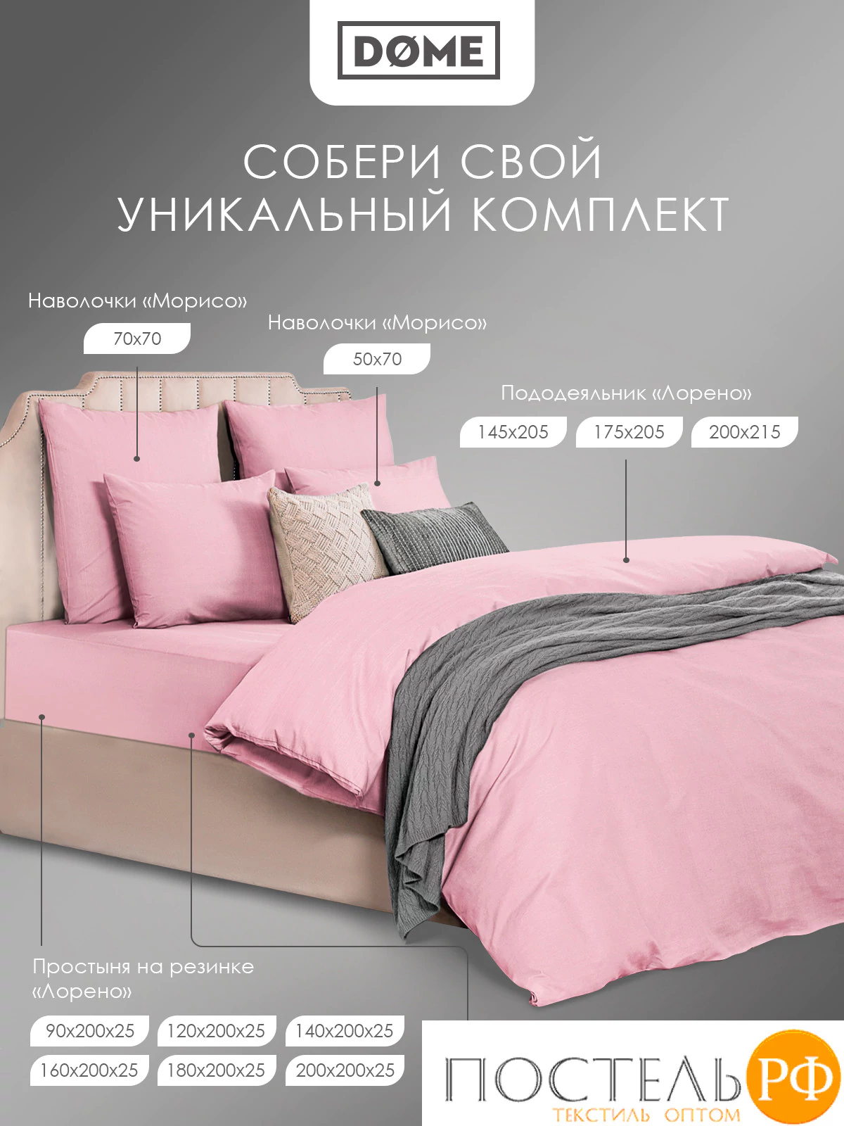 Комплект наволочек размером 70х70 см- 2 шт коллекции «МОРИСО» бренда DOME изготовлен из натурального хлопка в плетении сатин высокого качества плотностью 120 г/м2.