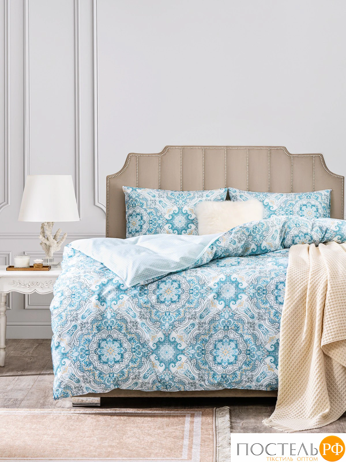 Двусторонний дизайн постельного белья позволяет легко менять облик спальни по вашему желанию. Комплект поражает своим ярким и стильным дизайном. Он выполнен в нежных бирюзовых оттенках с изысканным орнаментом, который создает атмосферу легкости и свежести. Узор сочетает в себе плавные линии и цветочные элементы, что придает комплекту романтичный и элегантный вид, а ткань-компаньон с мелким геометрическим рисунком добавляет легкости. Этот комплект идеально подойдет для интерьеров в стиле прованс или современном дизайне, подчеркивая вашу индивидуальность.