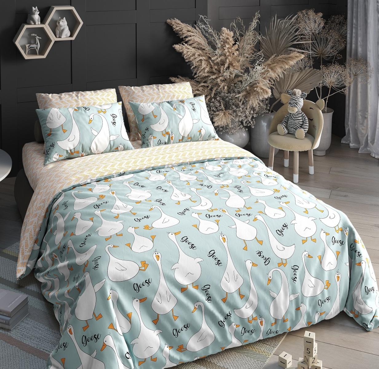 Комплект постельного белья выполнен из поплина, хлопковой мягкой ткани. Постельное белье из поплина спокойно выдерживает многократные стирки в стиральной машине без ухудшения внешнего вида и устойчиво к изнашиванию. А популярный и стильный принт гусей добавит в вашу спальню особого шарма и уюта.