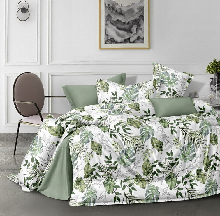 Поплин плотностью 110-115 г/кв.м, 100% хлопок Комплект выполнен "без оборок", наволочки с клапаном "без ушек". Пододеяльник с разрезом по нижнему краю