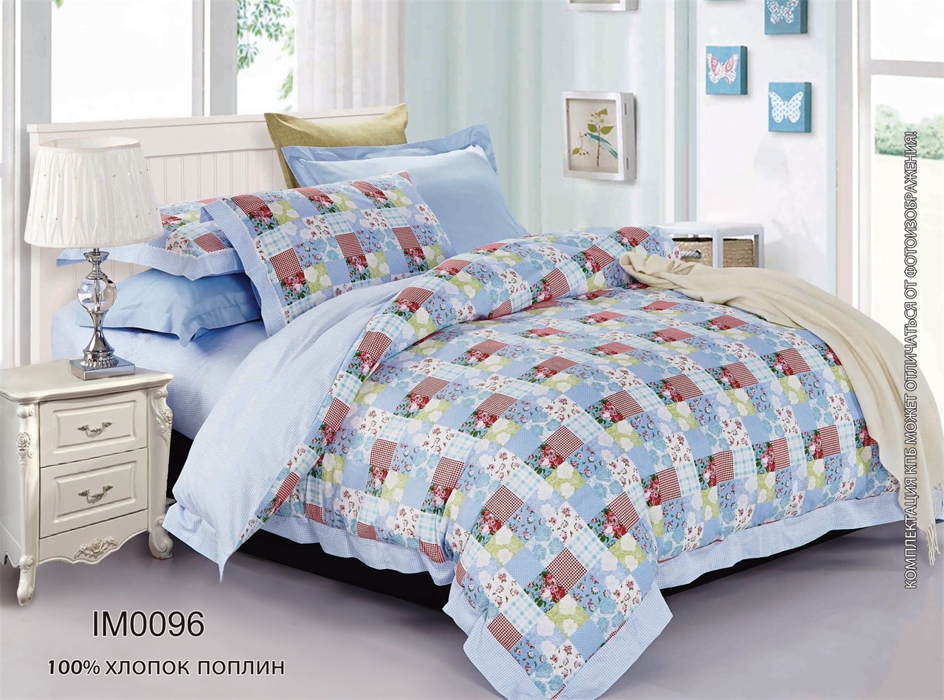 Комплект выполнен "без оборок", наволочки с клапаном "без ушек". Пододеяльник с разрезом по нижнему краю Поплин плотностью 110-115 г/кв.м, 100% хлопок