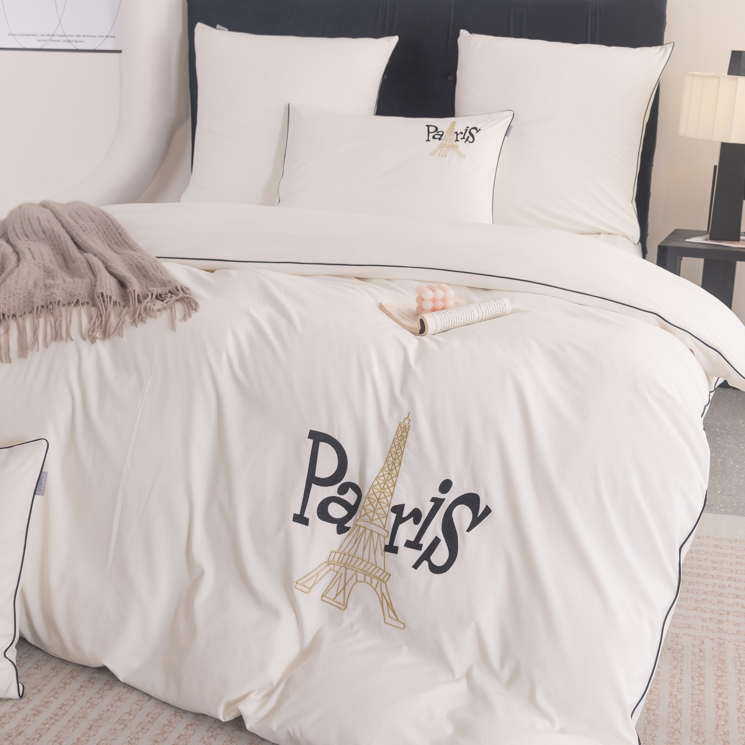 Дизайн дополняет элегантная вышивка с изображением Эйфелевой башни и надписью Paris, а изящный кант по периметру подчёркивает утончённость каждого комплекта.