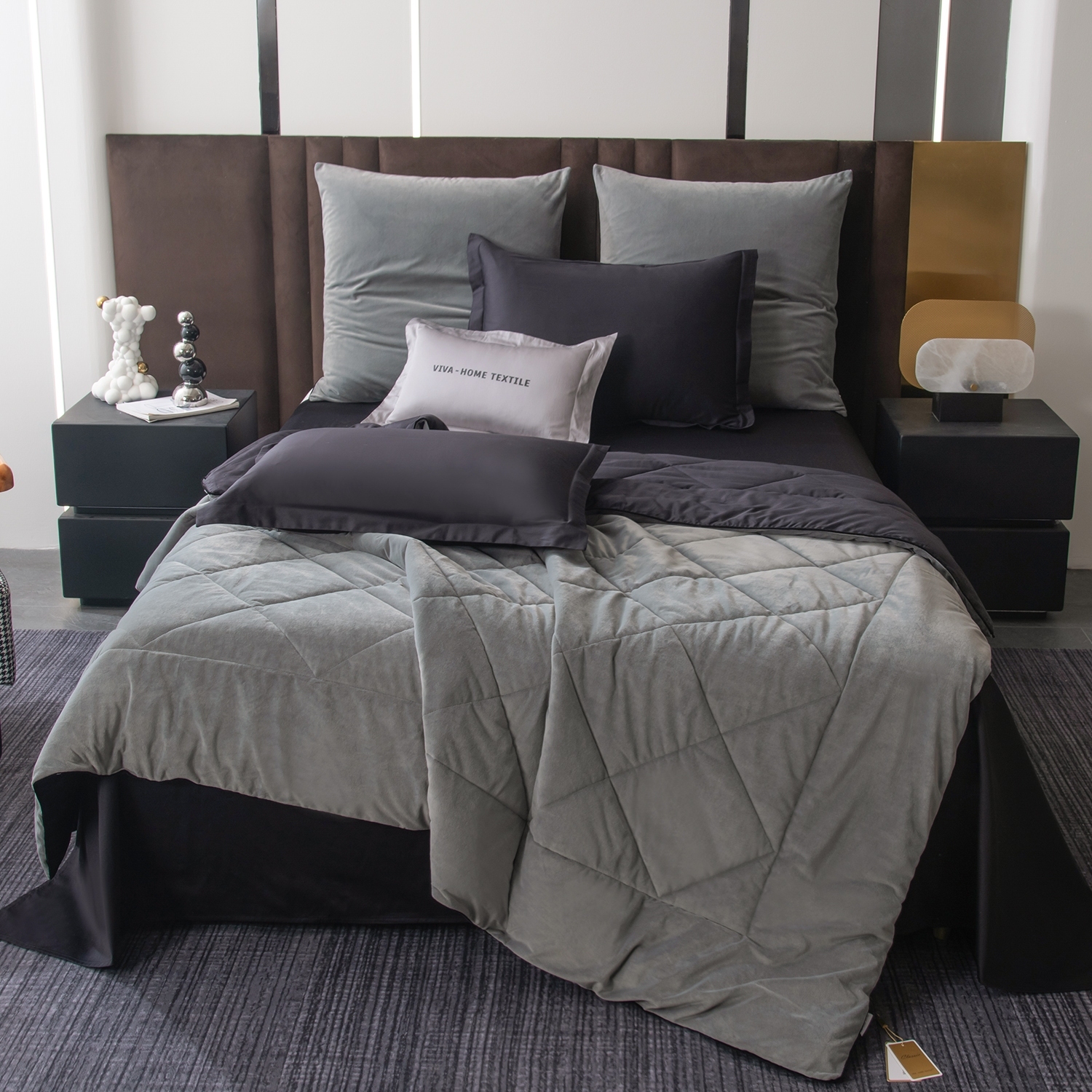 Одеяло выполнено с изысканной геометрической стёжкой и оформлено бархатным кантом. Верхняя сторона - мягкий велюр, придающий комплекту благородный внешний вид и особую уютность. Нижняя сторона - гладкий сатин из 100% египетского хлопка, отличающийся особой прочностью, шелковистым блеском и естественной воздухопроницаемостью. Наполнитель - современное 100% эковолокно микрогель: лёгкий, гипоаллергенный материал, который сохраняет форму даже после многократных стирок. Зимой под таким одеялом тепло и комфортно, а летом - свежо и легко, благодаря отличной циркуляции воздуха