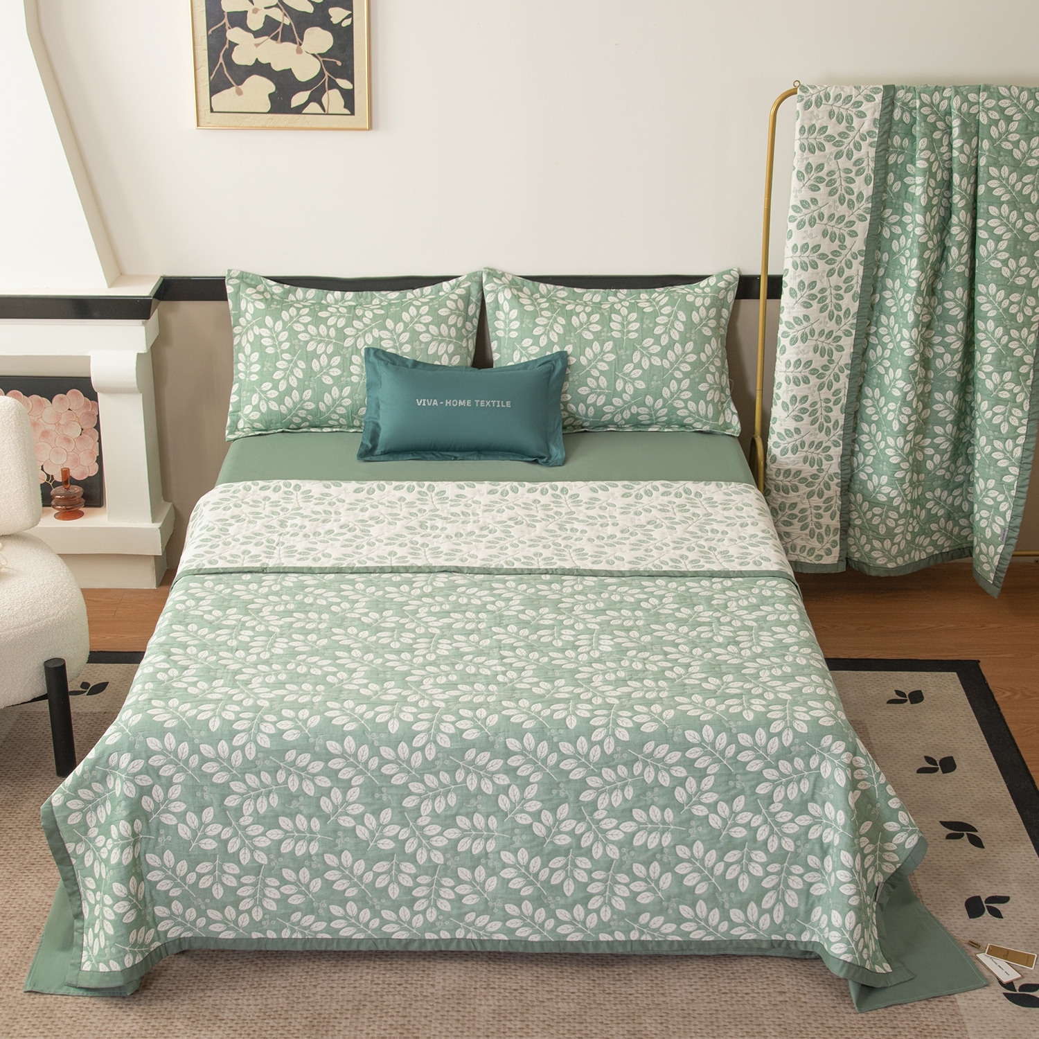 Реверсивный дизайн покрывала с инверсией оттенков позволяет выбрать настроение пространства: на одной стороне - светлый фон с мягким контрастным рисунком, на другой - более тёмный фон со светлым узором. Игра фактур и тонов делает покрывало выразительным акцентом в интерьере и позволяет легко менять облик спальни