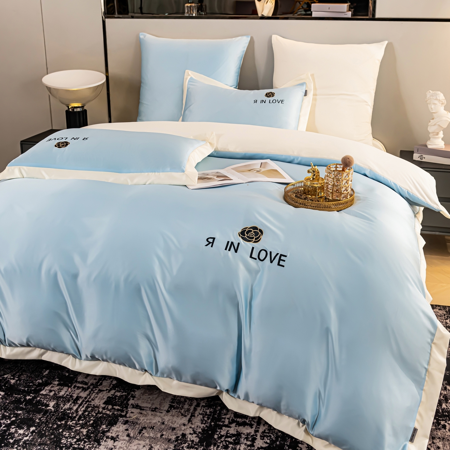 Каждый комплект украшен элегантной вышивкой с цветком и фразой "Я IN LOVE". Это придает постельному белью особый шарм, делая его прекрасным подарком для любимых.