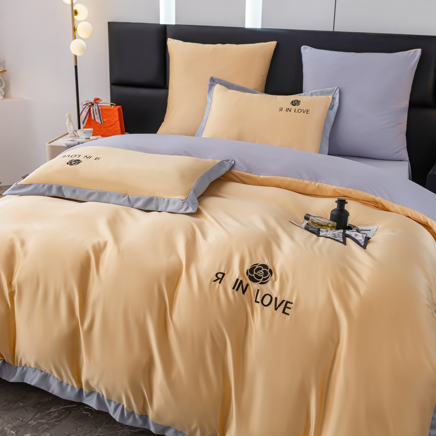 Каждый комплект украшен элегантной вышивкой с цветком и фразой "Я IN LOVE". Это придает постельному белью особый шарм, делая его прекрасным подарком для любимых.