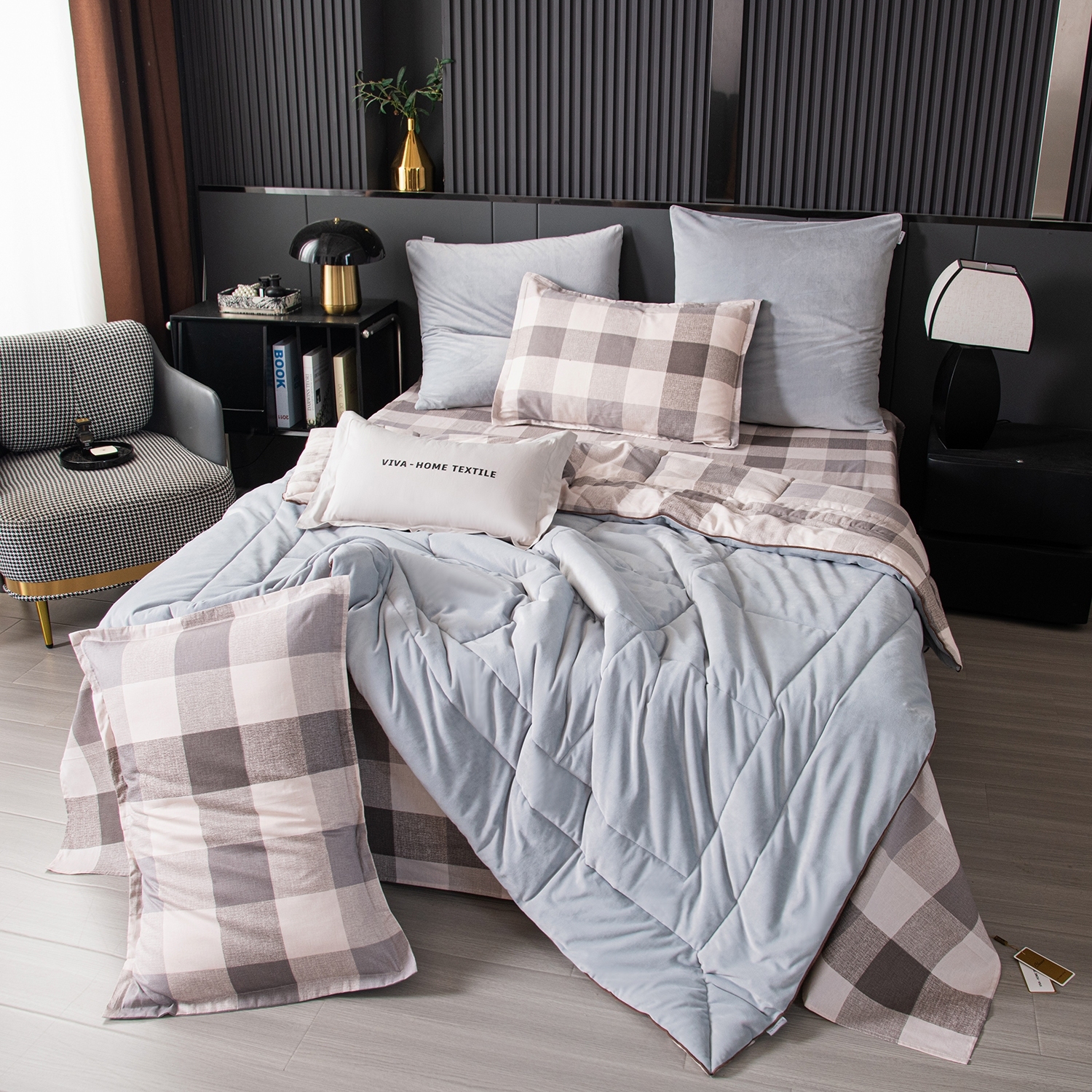 Ткань компаньон: Одеяло и наволочки 70x70 с разных сторон разной расцветки и ткани; наволочки 50x70 с разных сторон разной расцветки (принт/однотонный); простыня такого же цвета, как низ одеяла.