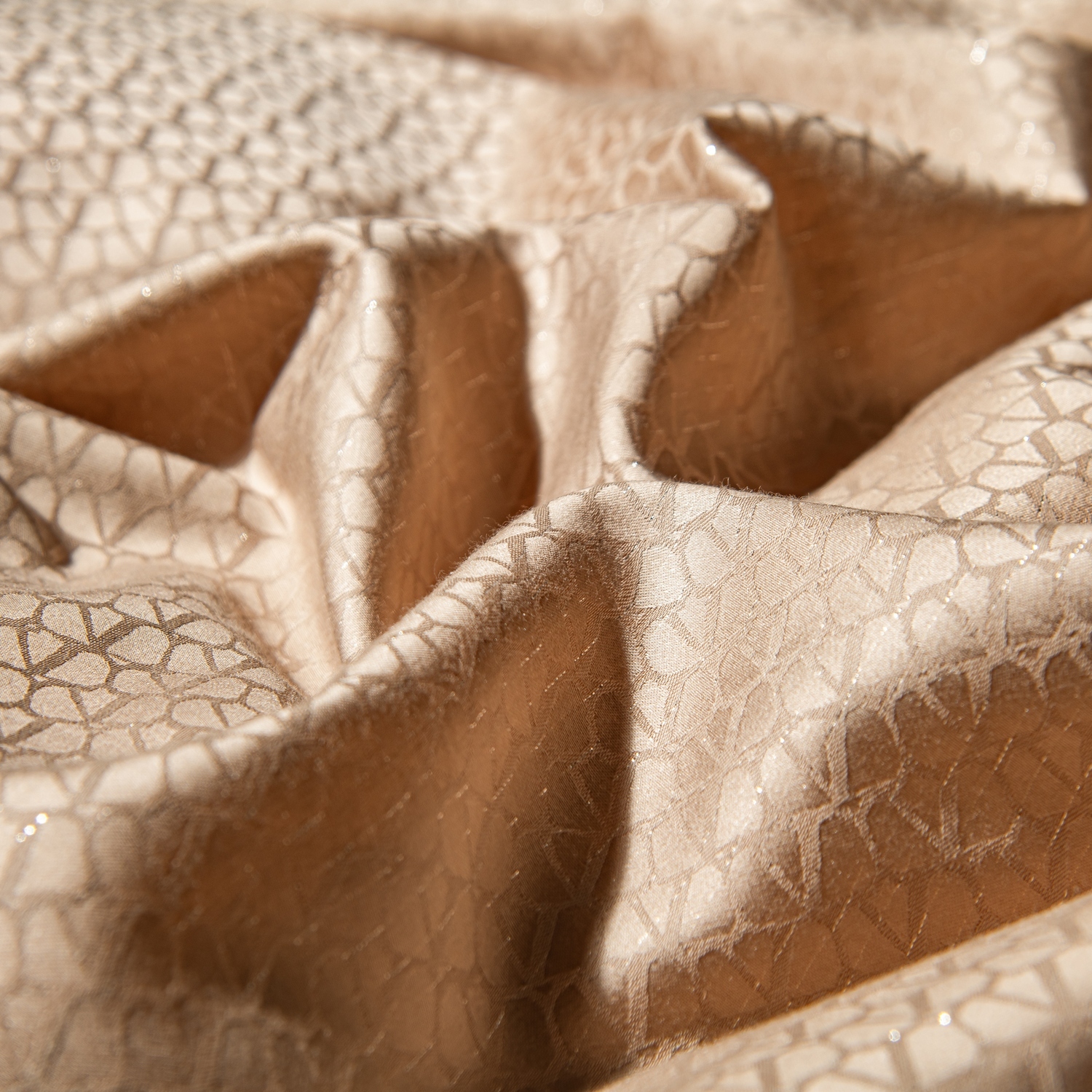 Жаккард из 100% хлопка, сотканный на специальных станках, впечатляет сложным рельефным рисунком. В переплетении используются тонкие золотые нити, которые мягко играют на свету, создавая мерцающий эффект, глубину узора и ощущение изысканной роскоши. Такой текстиль выглядит статусно и подчёркивает индивидуальность интерьера.