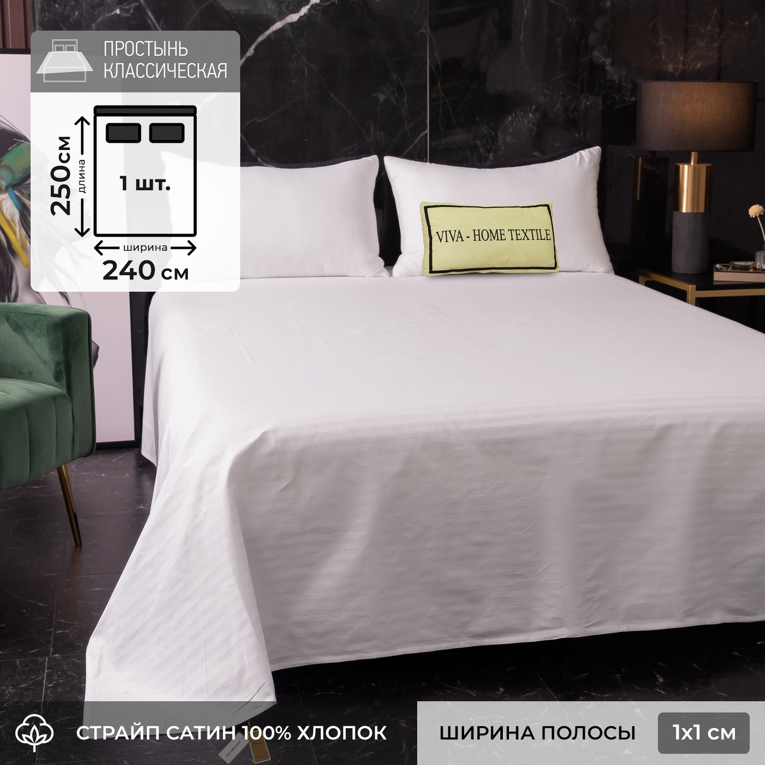 Простыня Страйп Сатин Однотонный Отель белый 100% хлопок 1x1 R1CTH036240250
