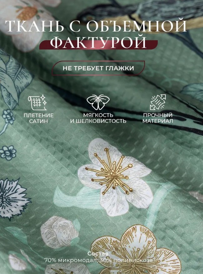 Белье изготовлено из уникальной ткани в составе которой 70% микромодал 30% поливискоза в плетении сатин с тиснением 3D.