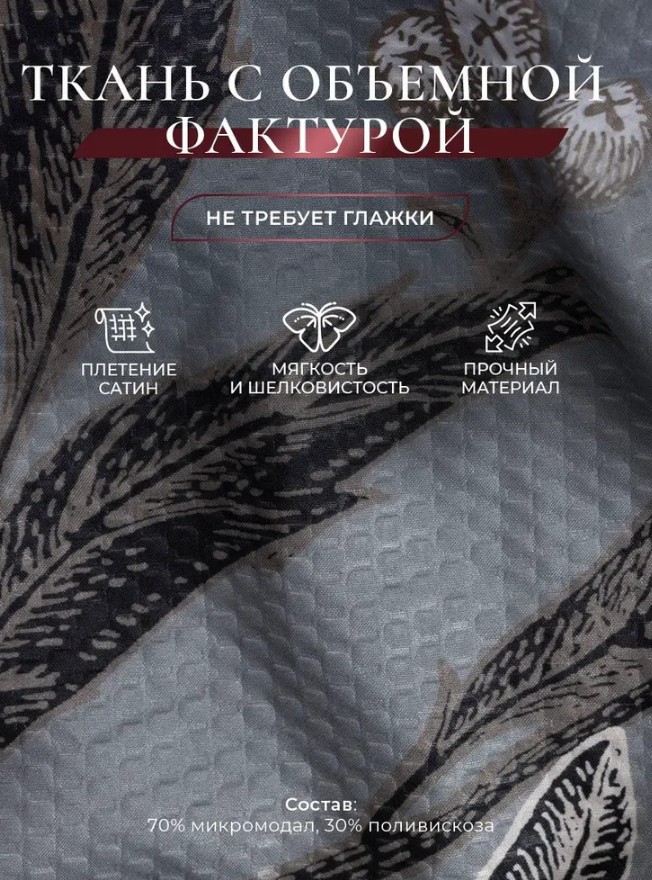 Белье изготовлено из уникальной ткани в составе которой 70% микромодал 30% поливискоза в плетении сатин с тиснением 3D.
