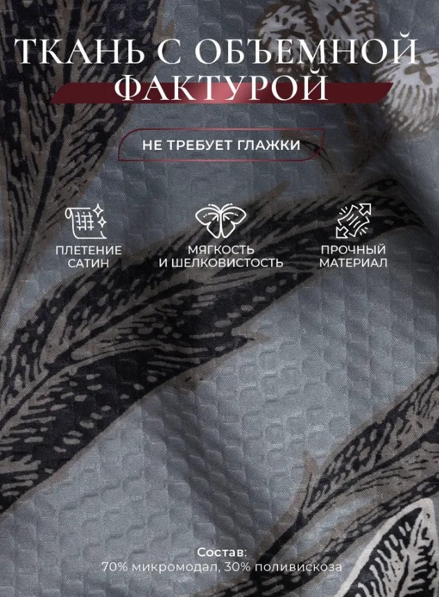 Белье изготовлено из уникальной ткани в составе которой 70% микромодал 30% поливискоза в плетении сатин с тиснением 3D.