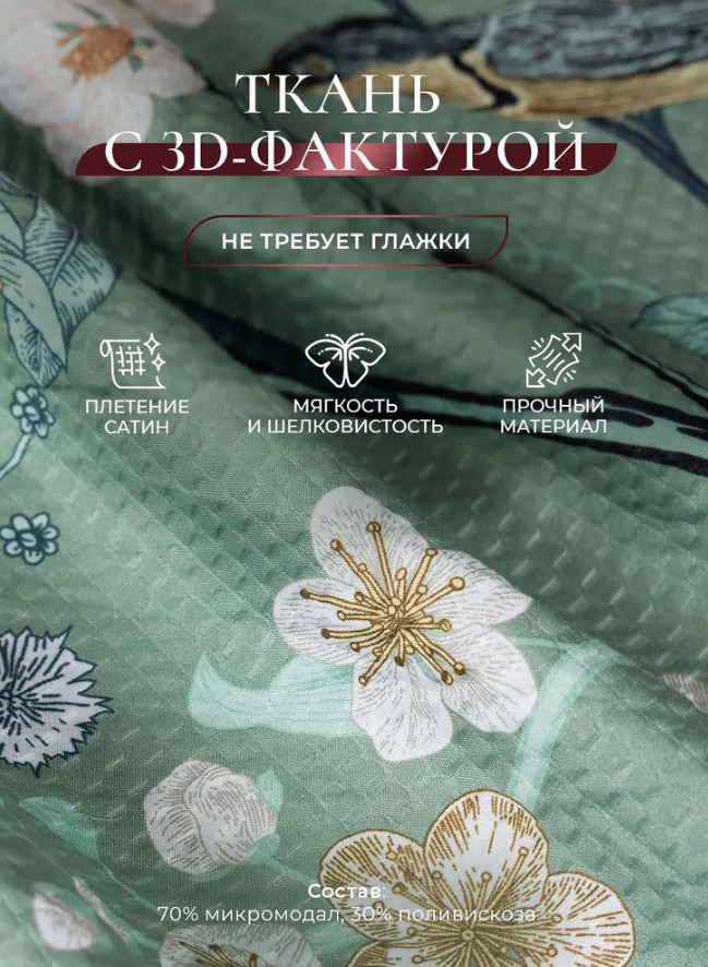 Белье изготовлено из уникальной ткани в составе которой 70% микромодал 30% поливискоза в плетении сатин с тиснением 3D.