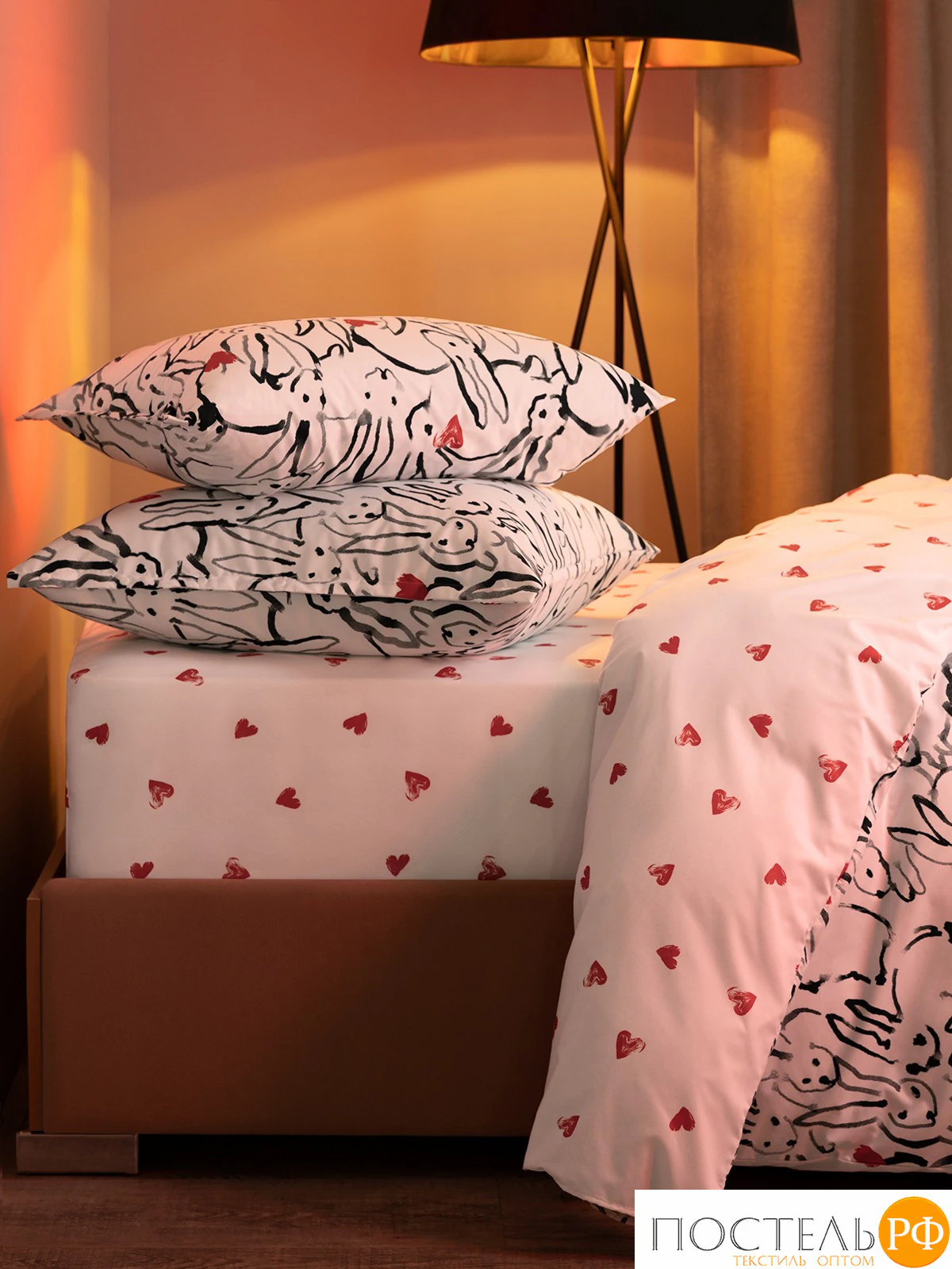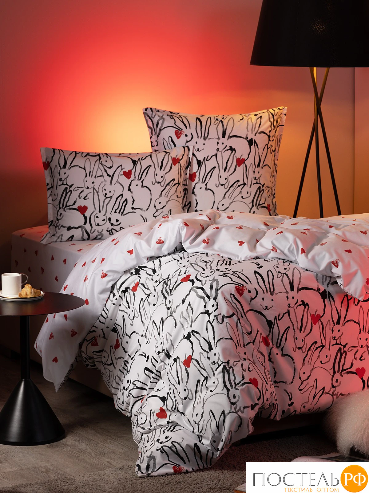Постельное белье оформлено в игривом дизайне с изображением милых кроликов в черно-белых оттенках, что придаёт ему лёгкость и задор. Яркие красные сердечки на белом фоне добавляют акценты, создавая ощущение тепла и романтики. Такое сочетание цвета и стиля идеально подойдёт для создания уютной и жизнерадостной атмосферы в спальне.