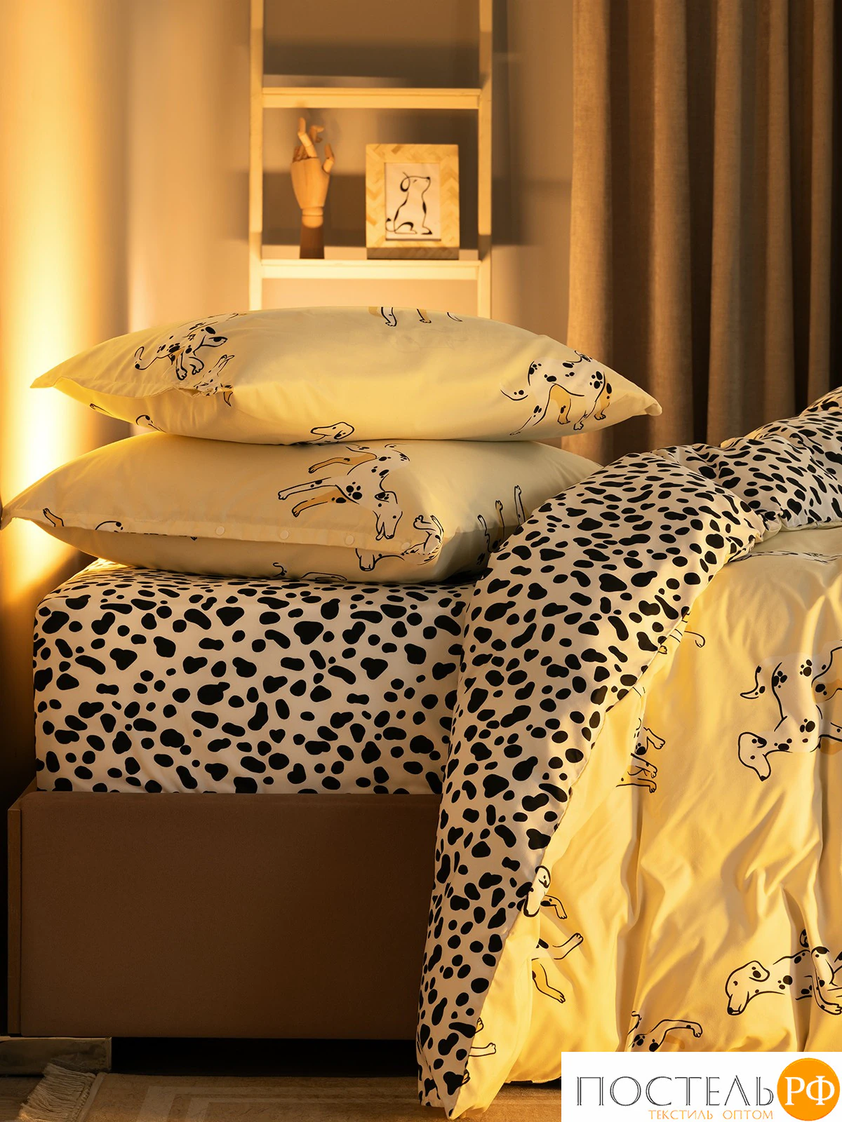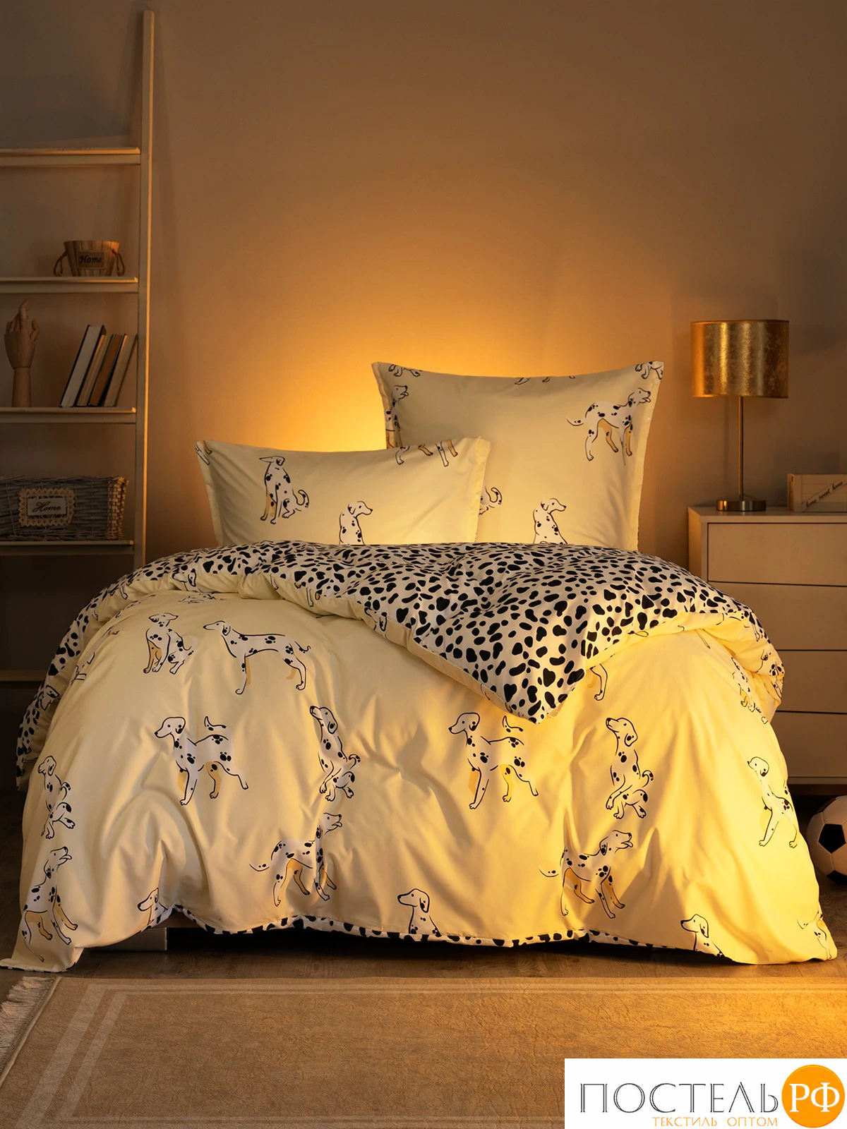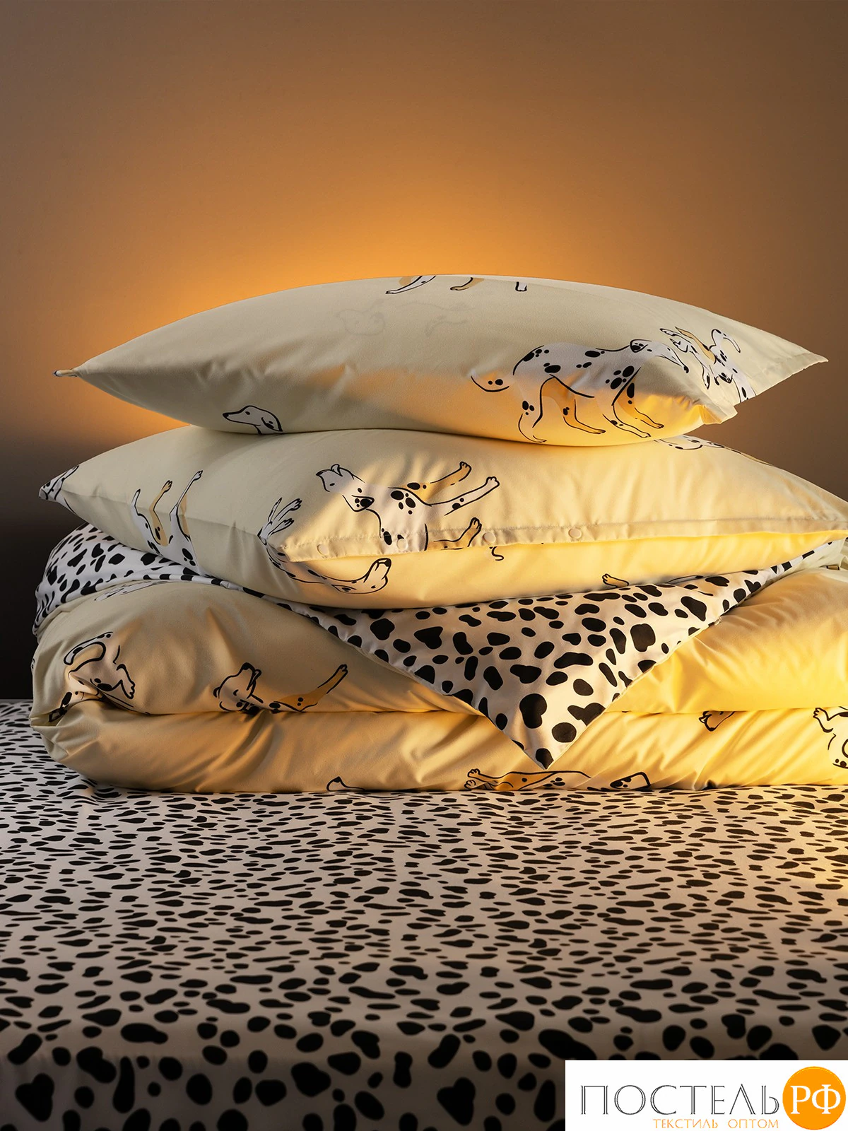 Постельное белье оформлено в игривом принте с изображениями милых далматинов, которые добавляют атмосферу веселья и уюта. Основной фон выполнен в нежном кремовом цвете, а узор с черными пятнами создает контраст и динамику, придавая комплекту современный вид. Такое оформление станет ярким акцентом в интерьере, идеально подходящим для любителей собак и необычного дизайна.