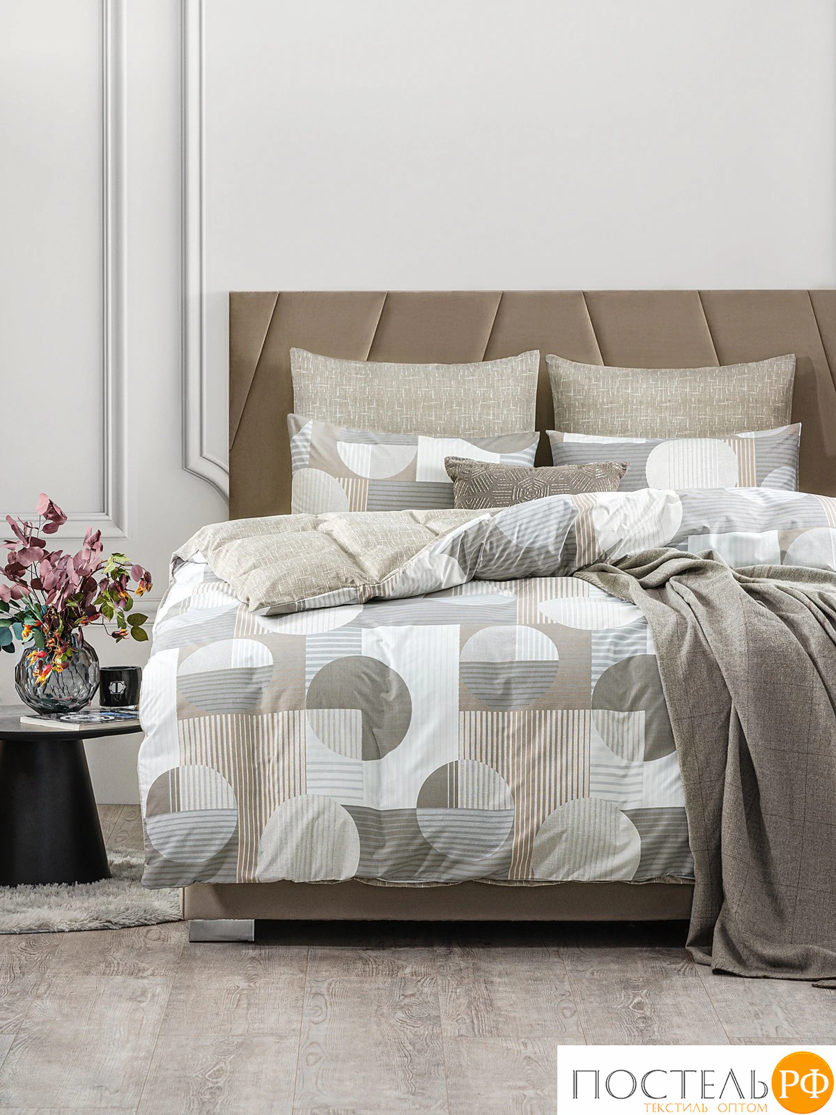 Постельное белье Грамс выполнено в стильных нейтральных тонах с современным геометрическим узором, состоящим из кругов и линий. Основная текстура сочетает в себе мягкие бежевые и серые оттенки, создавая гармоничную и уютную атмосферу. Ткань-компаньон с абстрактным узором дополняет общий дизайн, придавая комплекту оригинальность и завершенность. Такой набор идеально подойдет для современных интерьеров, добавляя нотки стиля и элегантности. Мягкие цвета и выразительный дизайн способствуют созданию комфортной атмосферы, обеспечивая полноценный отдых и расслабление. Этот комплект станет стильным акцентом в вашем интерьере, подчеркивая вашу индивидуальность и вкус.
