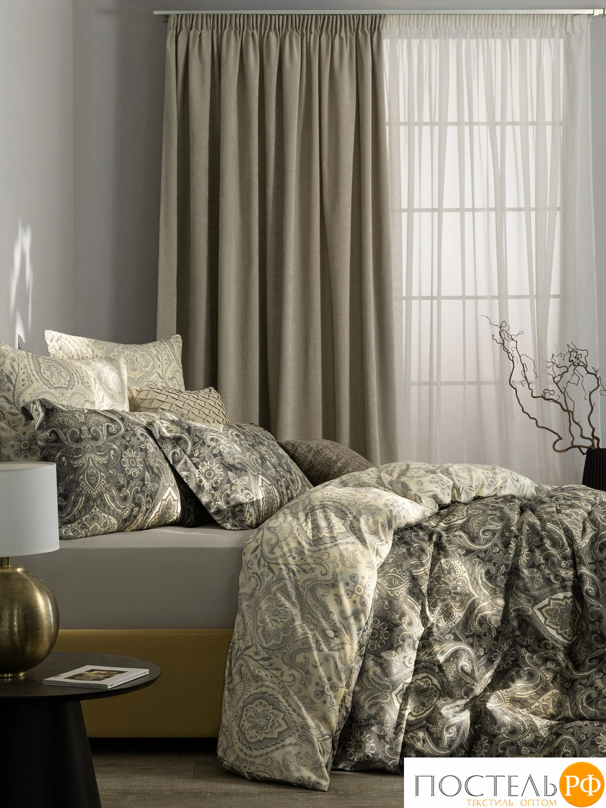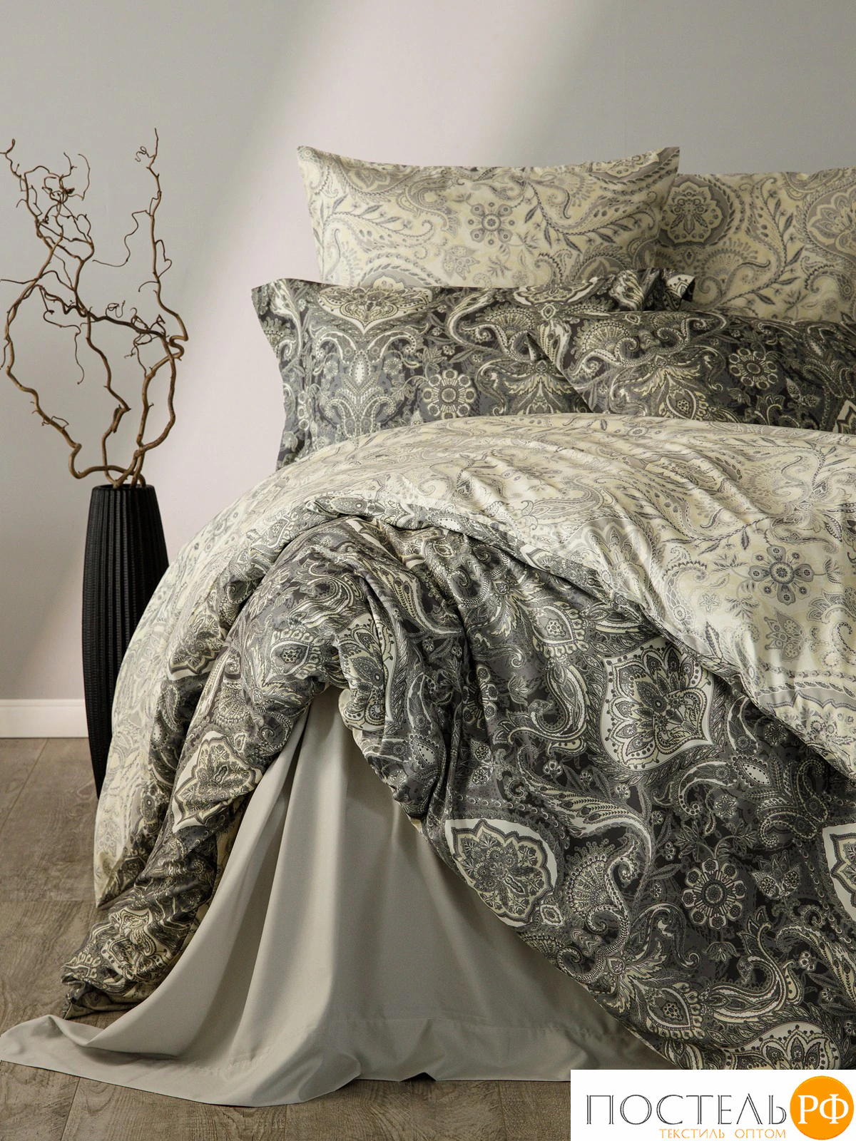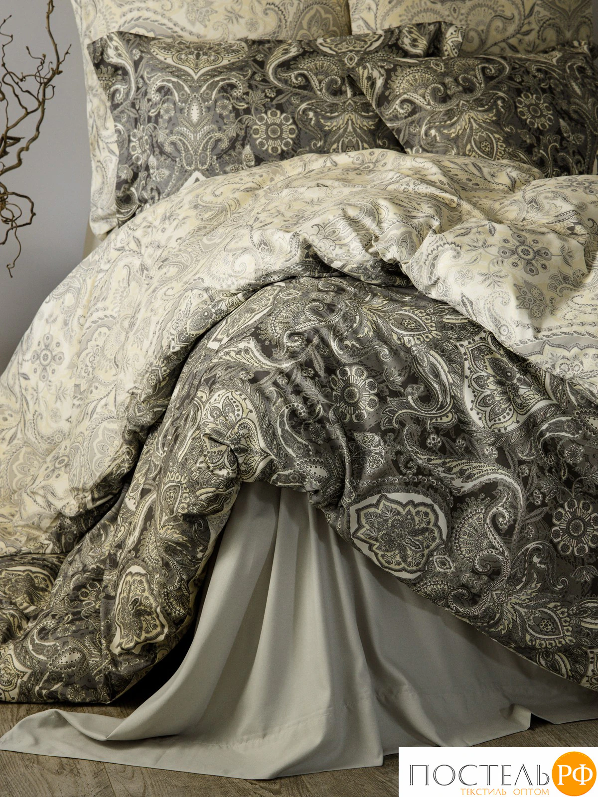 Двусторонний дизайн позволяет легко обновлять облик вашей спальни, а застёжка пододеяльника на молнии обеспечивает удобство в использовании. Постельное белье оформлено в элегантной палитре серых и бежевых оттенков, создавая атмосферу изысканности и утонченности. Восточный принт с узорами в стиле пейсли добавляет глубину и шарм, придавая комплекту классический вид. Это сочетание цвета и дизайна станет стильным акцентом в интерьере, наполняя спальню атмосферой комфорта и изысканности.