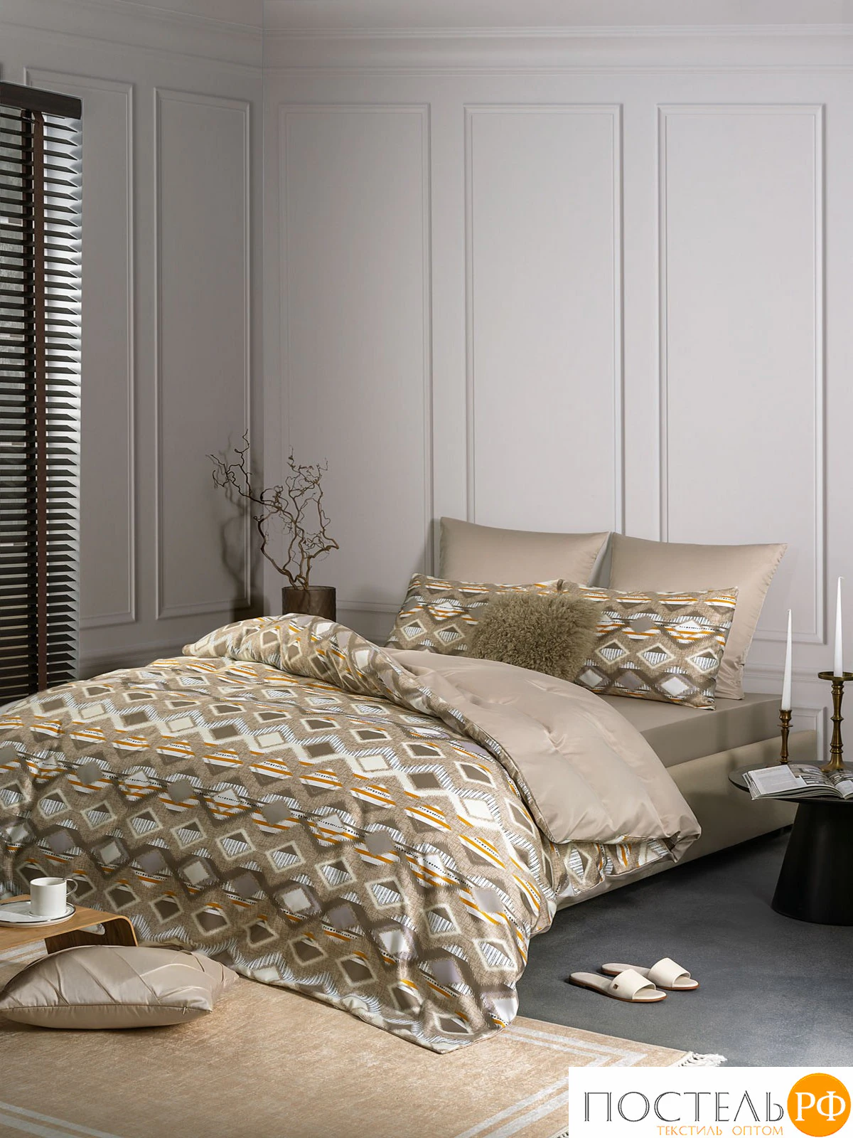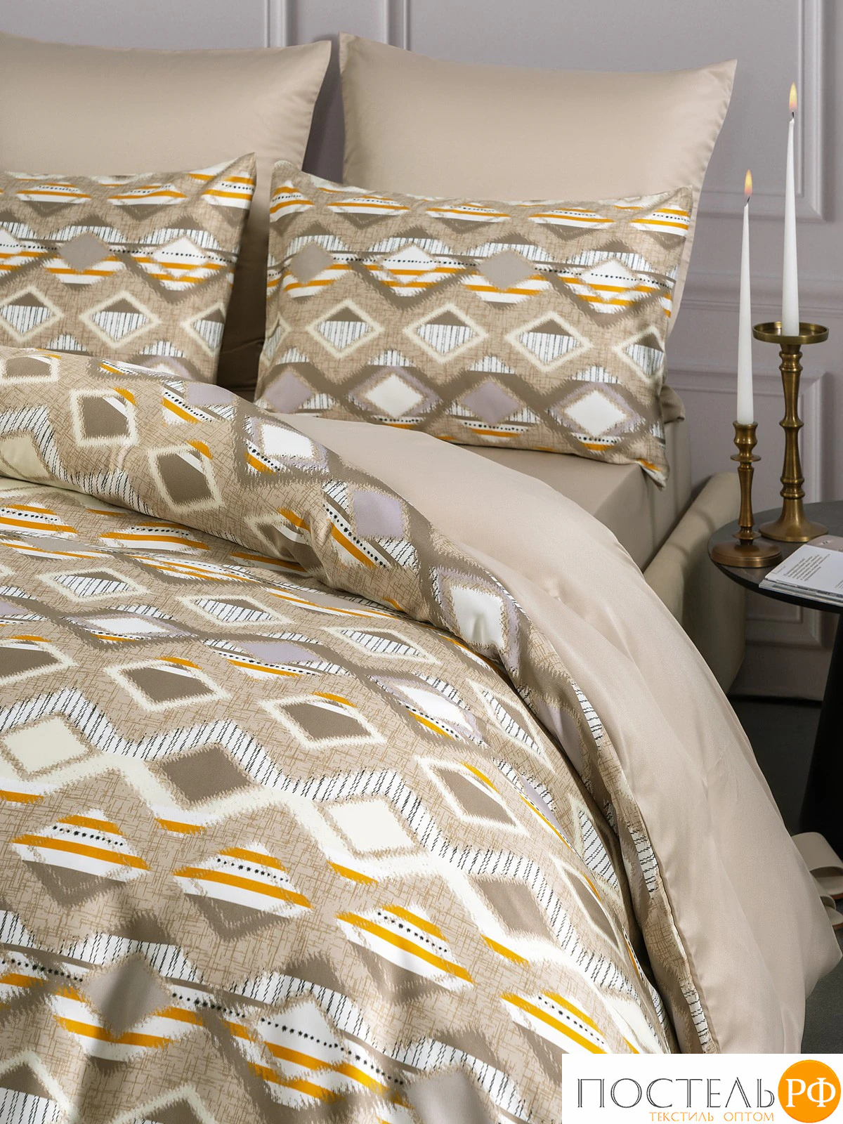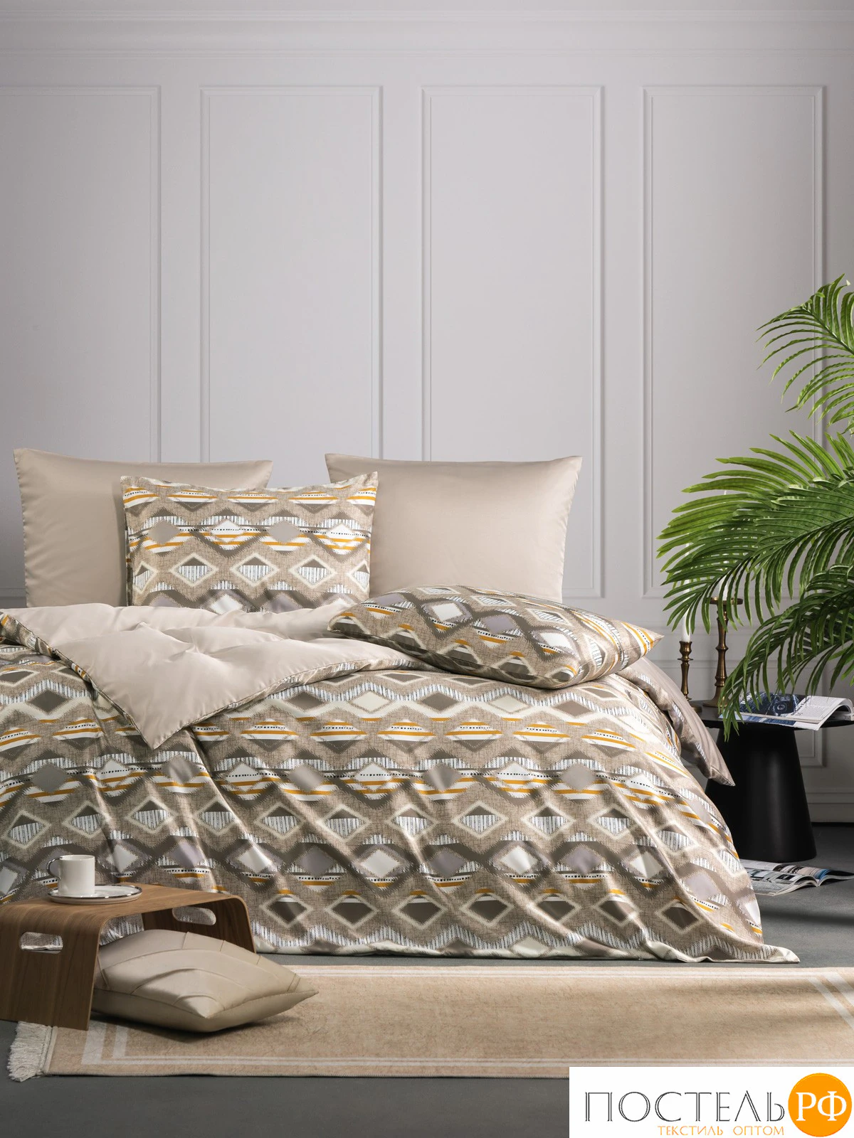 Постельное белье Валдис выполнено в теплых бежевых и коричневых тонах с выразительным геометрическим узором. Основная текстура сочетает ромбовидные элементы, украшенные яркими оранжевыми и белыми акцентами, что создает современный и стильный вид. Ткань-компаньон в однотонном бежевом цвете гармонично дополняет комплект, придавая ему завершенность и аккуратность. Такой набор идеально подойдет для современных и уютных интерьеров, добавляя нотки стиля и комфорта. Мягкие цвета и выразительный дизайн способствуют созданию расслабляющей атмосферы, обеспечивая полноценный отдых и уют. Этот комплект станет стильным акцентом в вашем интерьере, подчеркивая вашу индивидуальность и вкус.