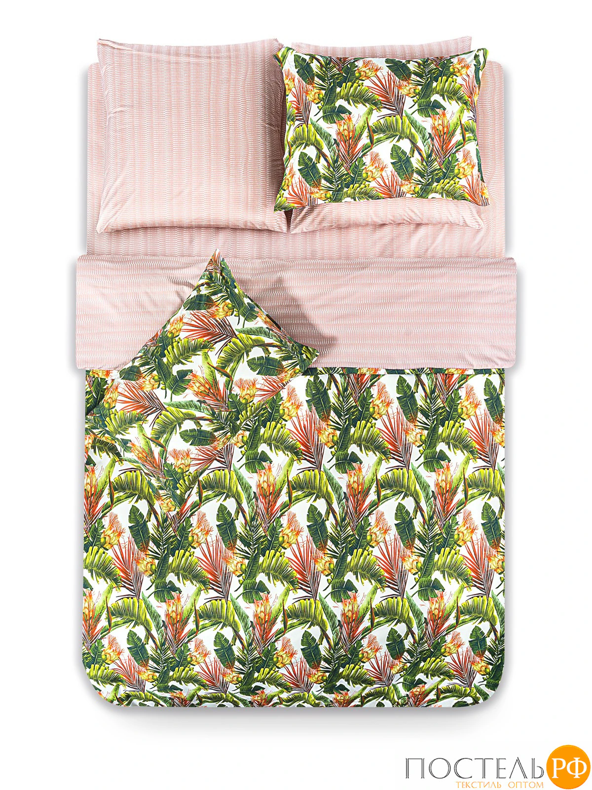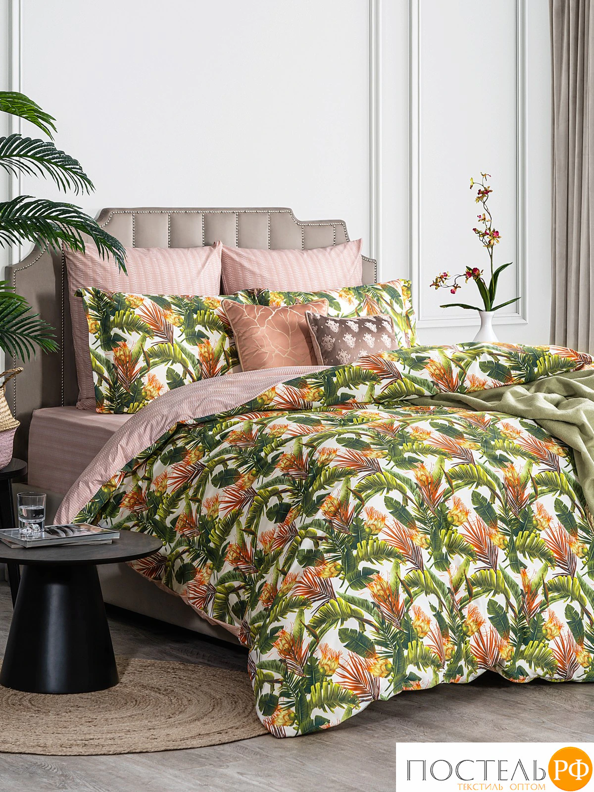 Двусторонний дизайн позволяет легко изменять облик вашей спальни, а застёжка пододеяльника на молнии делает использование комплекта более удобным. Комплект постельного белья привлекает внимание своим ярким и экзотическим дизайном. Цветочные элементы в насыщенных зеленых, оранжевых и желтых тонах наполняют пространство энергией и свежестью, а нежный цвет ткани-компаньон придает комплекту легкость и уют. Такой стиль идеально подходит для интерьеров в бохо или тропическом дизайне, добавляя в них нотки экзотики и яркости. Комплект станет отличным выбором для создания уютной и стильной атмосферы в вашей спальне, превращая её в оазис комфорта и вдохновения.