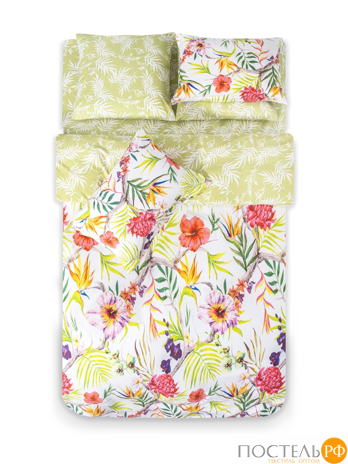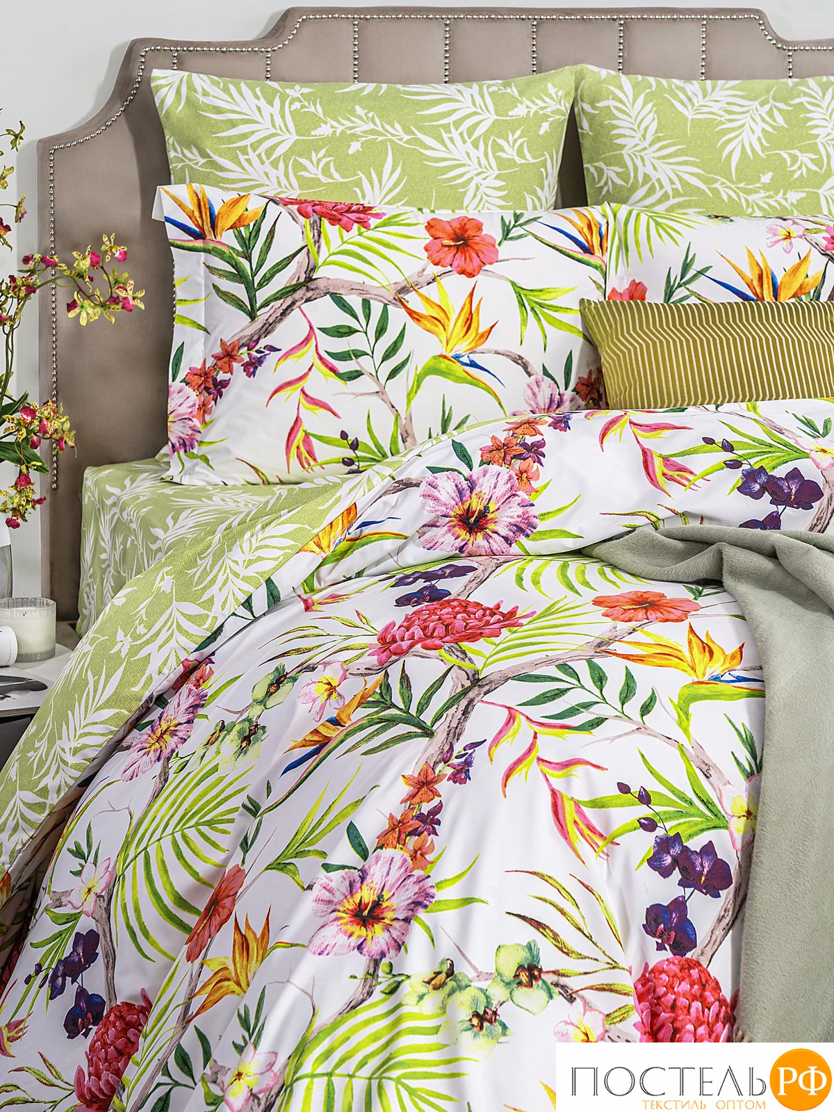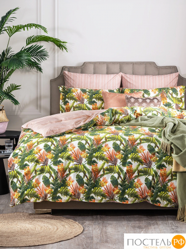 Постельное белье Каприс выполнено в ярких, насыщенных цветах с тропическим узором. Яркие цветы и зелёные листья на светлом фоне создают жизнеутверждающую атмосферу, наполняя спальню светом и свежестью. Ткань-компаньон с нежным растительным принтом создает атмосферу легкости и гармонично дополняет общий дизайн, придавая комплекту законченность. Такое белье идеально подойдет для современных и эклектичных интерьеров, добавляя в спальню нотки радости и жизнеутверждающей энергии. Его яркие цвета и выразительный дизайн способствуют созданию уютной и вдохновляющей атмосферы, обеспечивая полноценный отдых и расслабление. Этот комплект станет ярким акцентом в вашем интерьере, подчеркивая вашу индивидуальность и любовь к жизни.