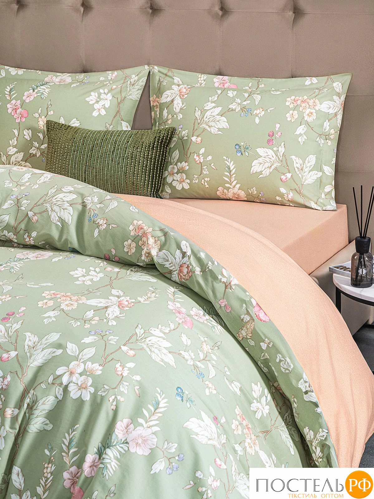 Двусторонний дизайн позволяет легко изменять облик вашей спальни, а застёжка пододеяльника на молнии делает использование комплекта более удобным. Стильный цветочный принт, элегантно расположенный на нежно-зелёном фоне, добавляет свежести и гармонии в интерьер, а яркая акцентная ткань-компаньон в теплых персиковых оттенках добавляет игривости и изысканности. Этот дизайн создаёт атмосферу спокойствия и прекрасно сочетается с различными стилями оформления, от классики до современного.