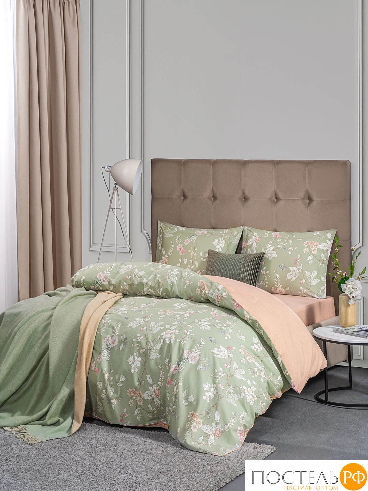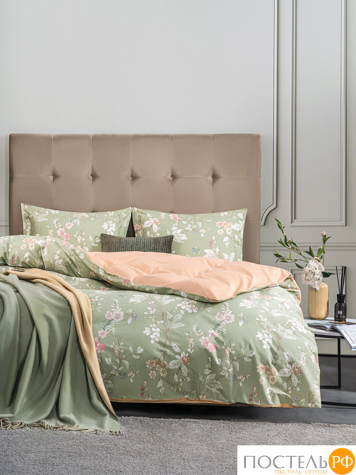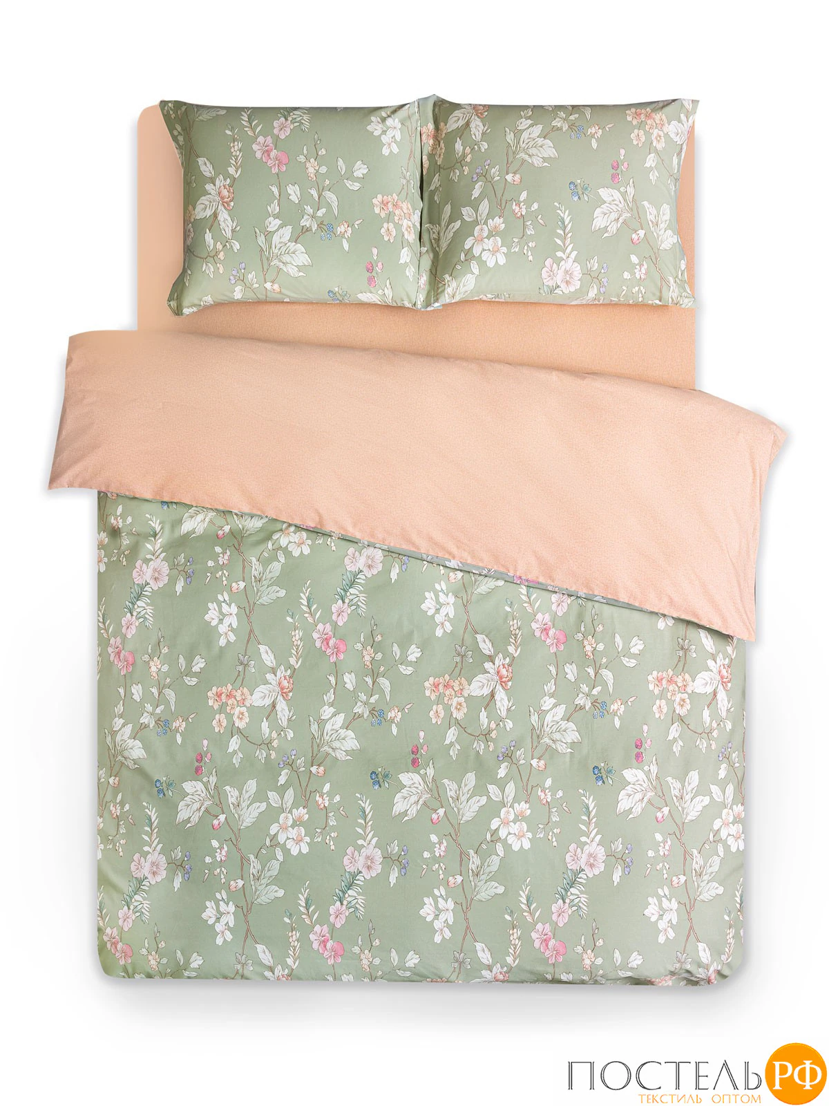 Двусторонний дизайн позволяет легко изменять облик вашей спальни, а застёжка пододеяльника на молнии делает использование комплекта более удобным. Стильный цветочный принт, элегантно расположенный на нежно-зелёном фоне, добавляет свежести и гармонии в интерьер, а яркая акцентная ткань-компаньон в теплых персиковых оттенках добавляет игривости и изысканности. Этот дизайн создаёт атмосферу спокойствия и прекрасно сочетается с различными стилями оформления, от классики до современного.