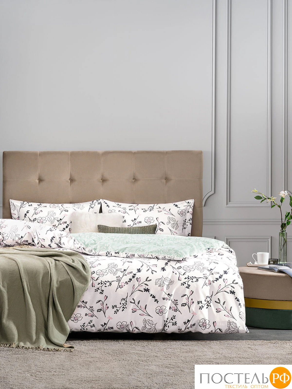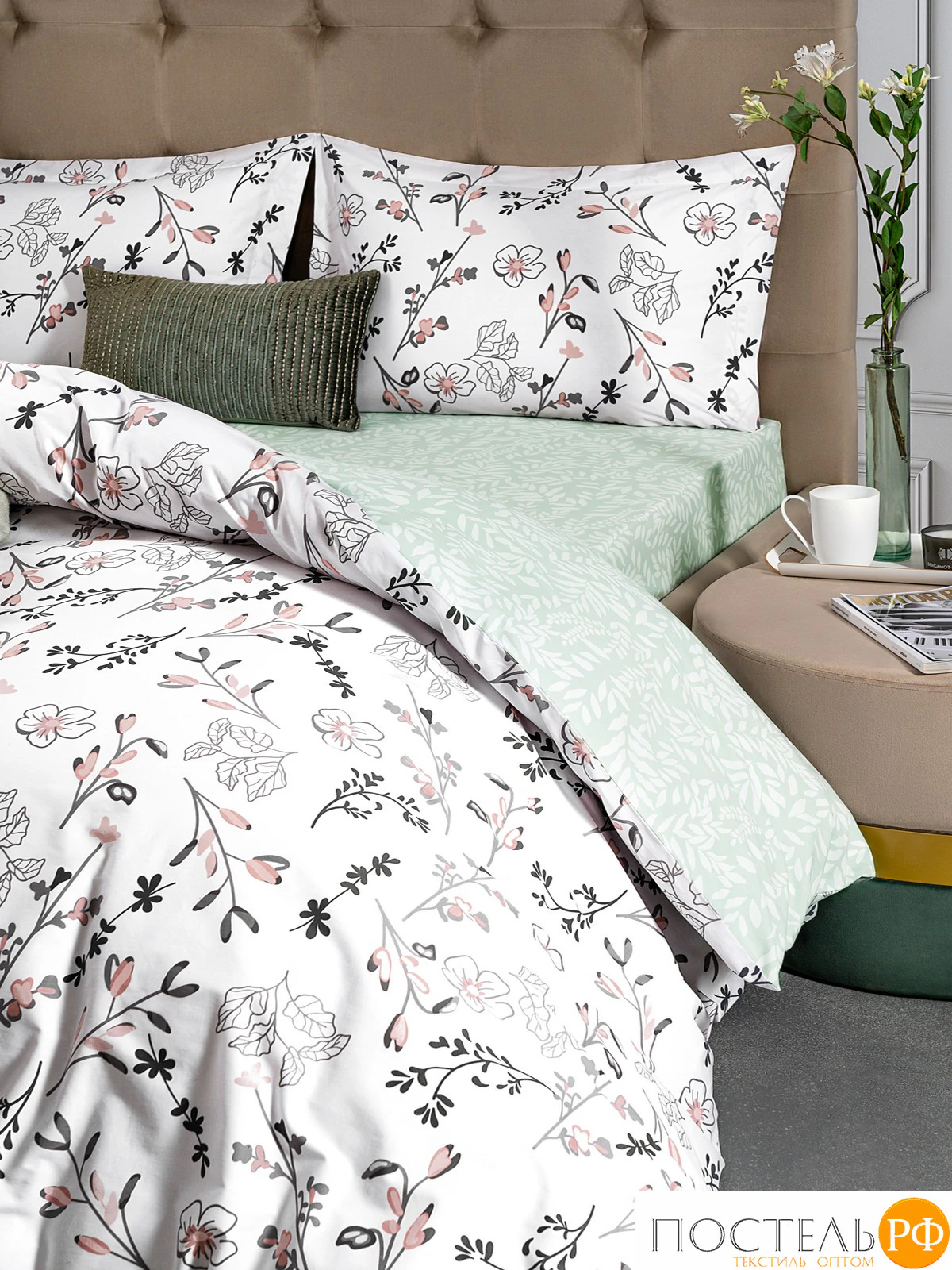 Двусторонний дизайн позволяет легко изменять облик вашей спальни, а застёжка пододеяльника на молнии делает использование комплекта более удобным. Этот комплект постельного белья привлекает внимание своим стильным и изящным дизайном. Нежный мятный фон создает уютную атмосферу, а цветочные мотивы в черно-белых тонах с яркими акцентами придают комплекту свежесть и оригинальность. Такой комплект идеально впишется в интерьеры в стиле скандинавского минимализма или прованс, добавляя в них нотки легкости и романтики. Он станет отличным выбором для создания теплой и комфортной обстановки в вашей спальне, где каждый сон будет приносить вдохновение и покой.