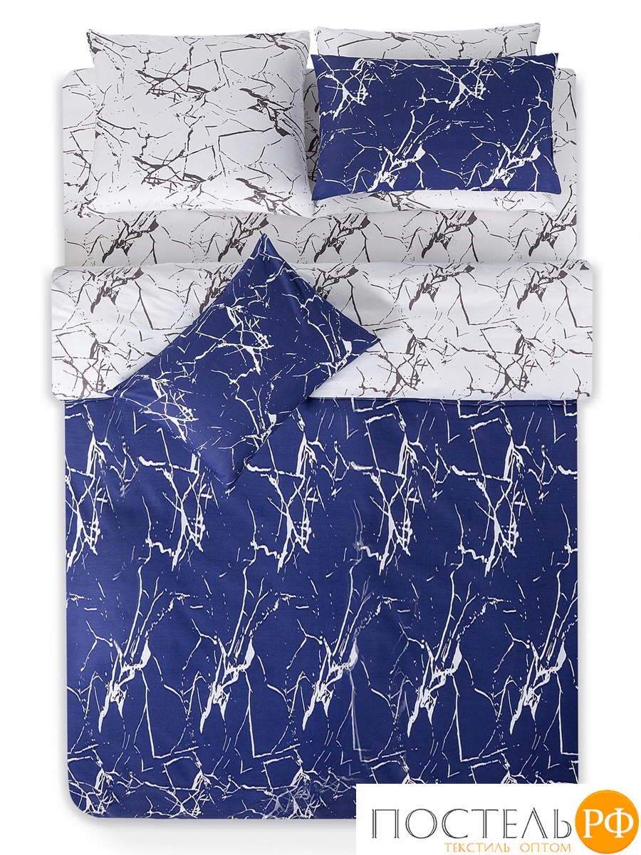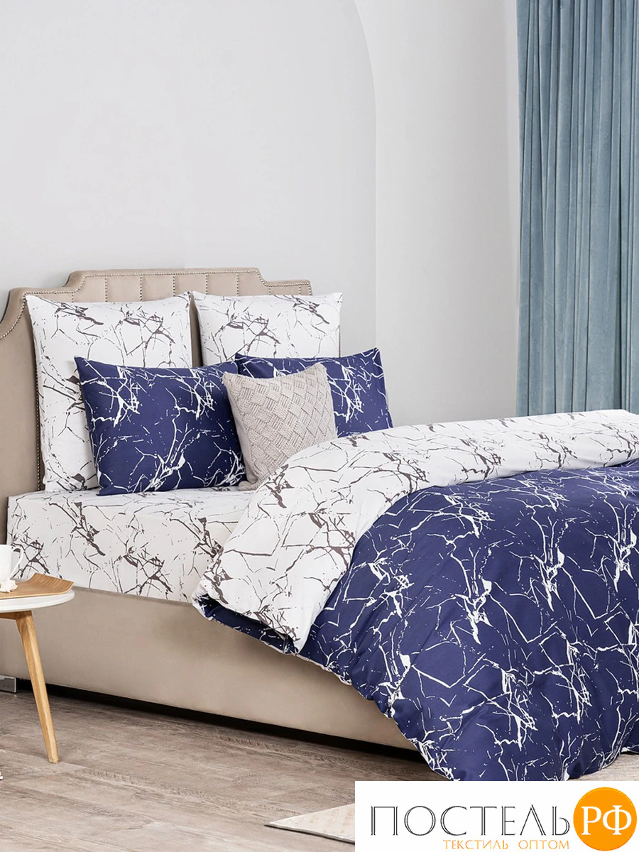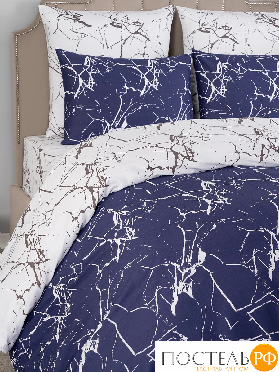 Уникальный дизайн с эффектом мраморных прожилок в темно-синих и белых тонах добавляет изысканности и современности, создавая атмосферу элегантности в спальне. Превосходная воздухопроницаемость и влагоотводящие свойства органического хлопка формируют комфортный микроклимат, способствуя приятному и крепкому сну. Этот комплект станет отличным акцентом в вашем интерьере, обеспечивая стильный и уютный отдых.