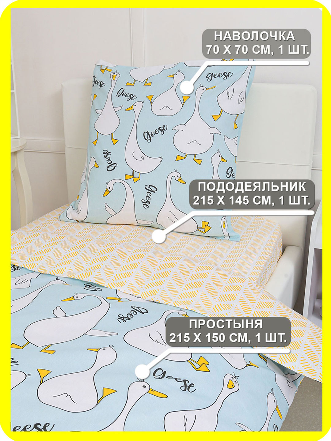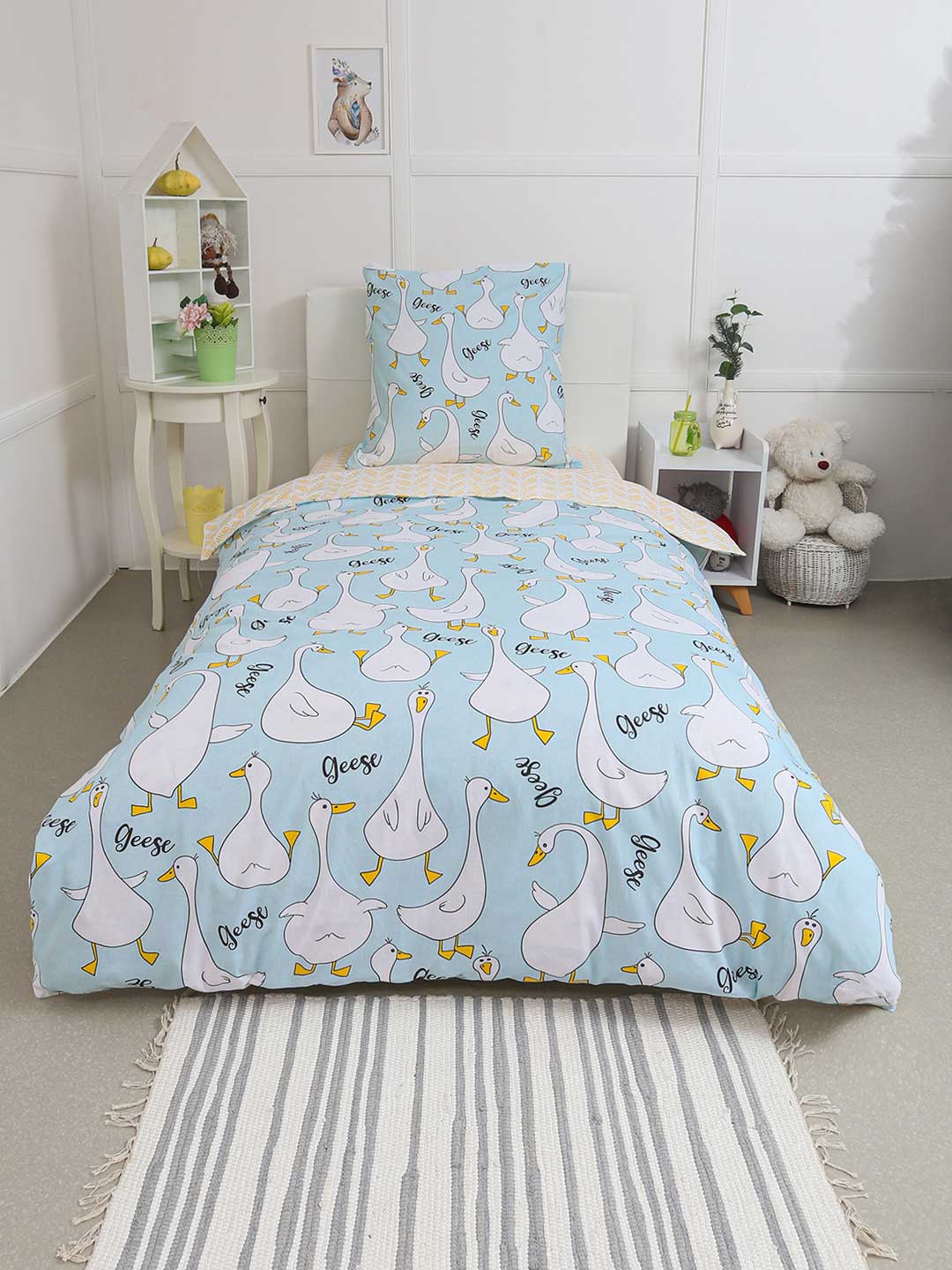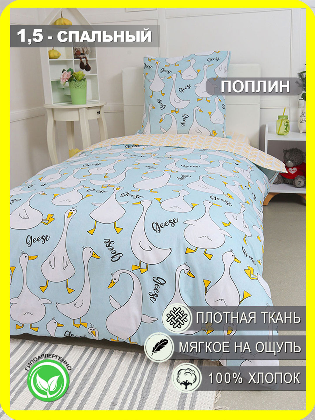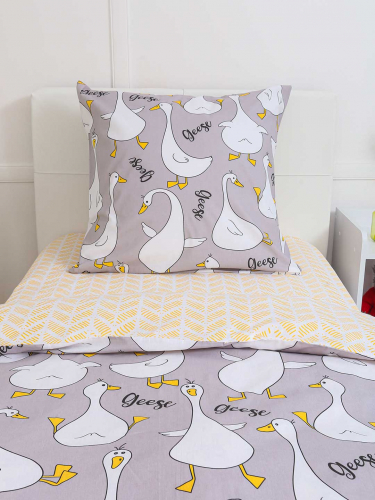 КПБ Поплин 1,5 сп с 1 нав. 70*70 с детским рисунком - Гусь-обнимусь (мята)