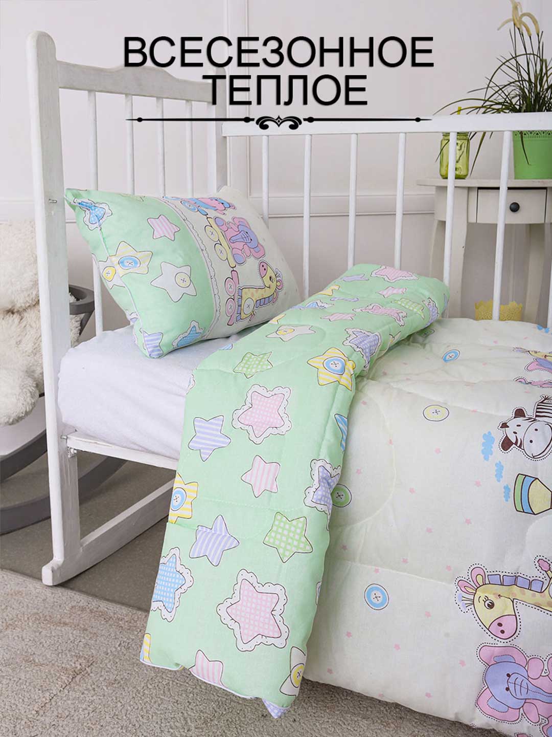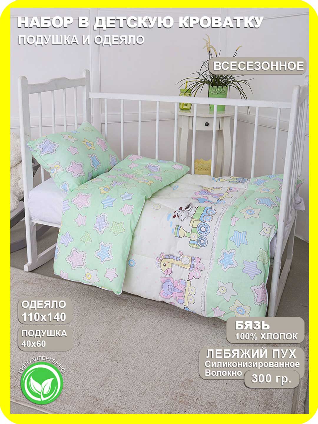 Набор в детскую кроватку, состоящий из плотного теплого лебяжьего одеяла, размером 110х140 см и удобной подушки 40х60 с антиаллергенным наполнителем. Чехол одеяла и подушки выполнен из 100% хлопка, что гарантирует высочайшее качество и комфорт во время отдыха.