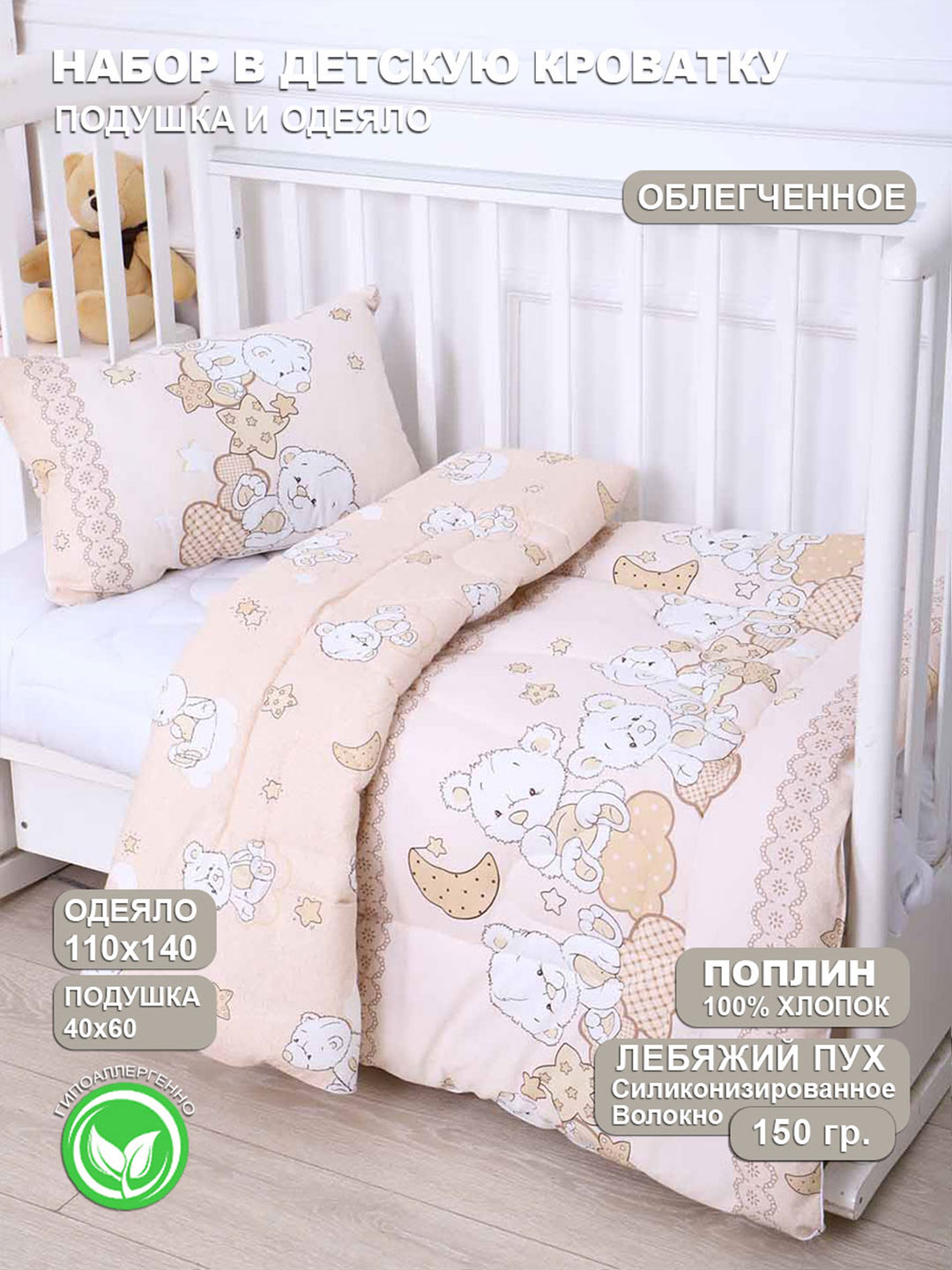 Набор в детскую кроватку, состоящий из облегченного лебяжьего одеяла, рассчитаного на теплый сезон, размером 110х140 см и удобной подушки 40х60 с полиэфирным наполнителем. Чехол одеяла и подушки выполнен из 100% хлопка, что гарантирует высочайшее качество и комфорт во время отдыха.