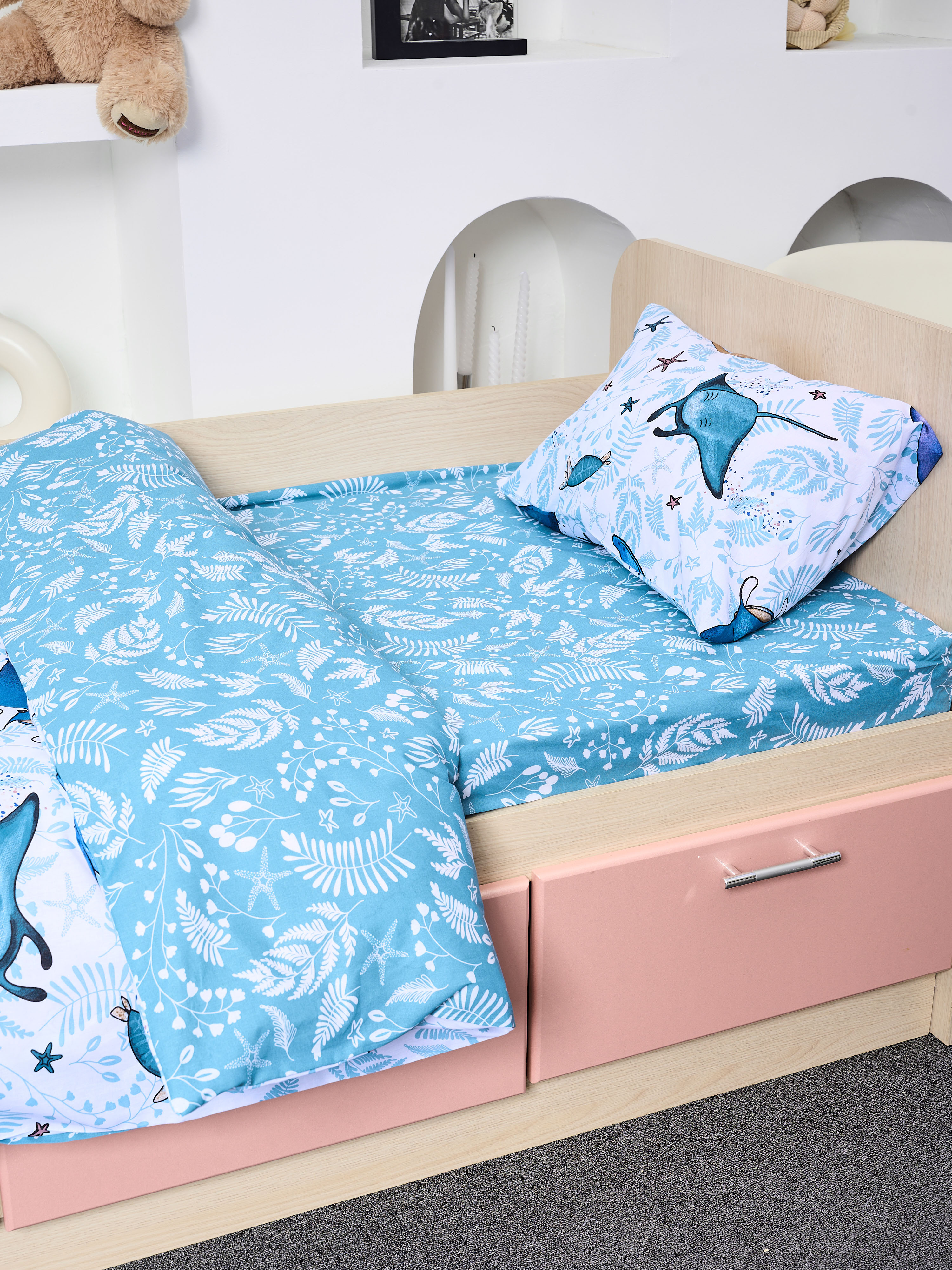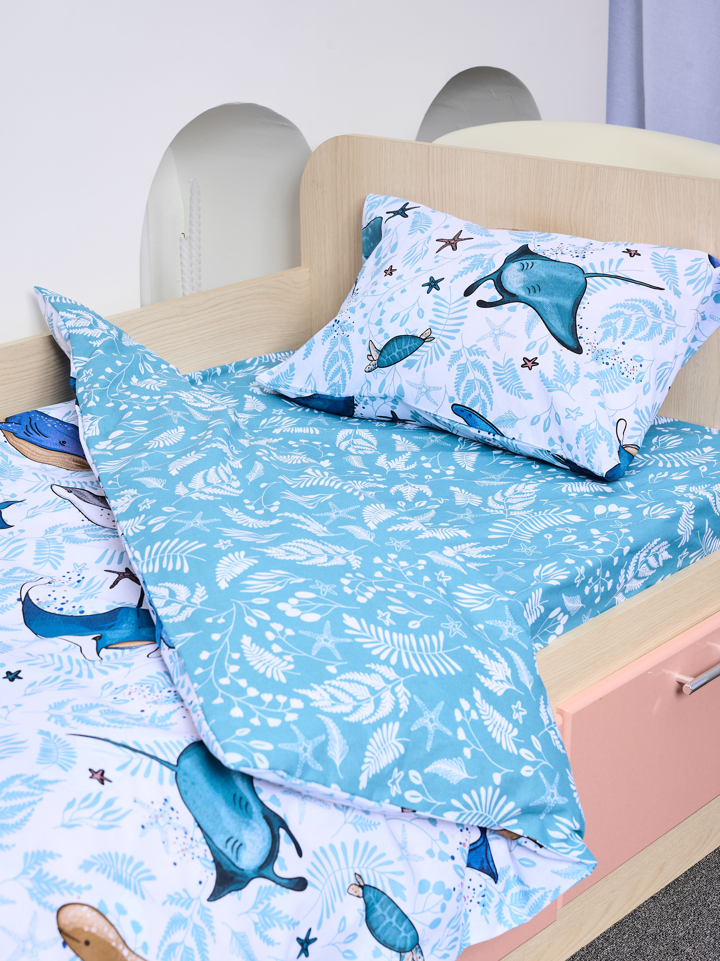 Постельное белье детское поплин с простыней на резинке - Киты