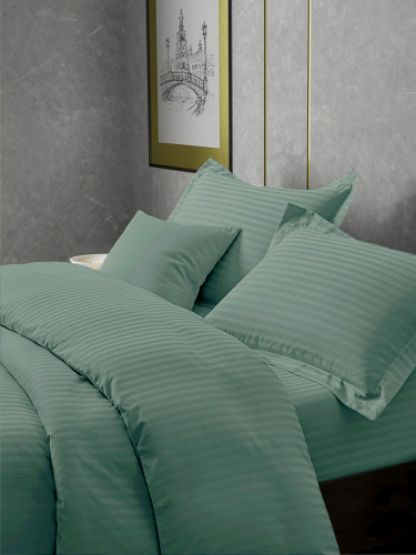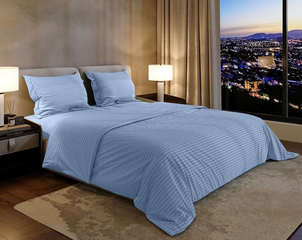 Постельное белье сатин страйп с простыней на резинке в подарочной упаковке - Голубая лаванда