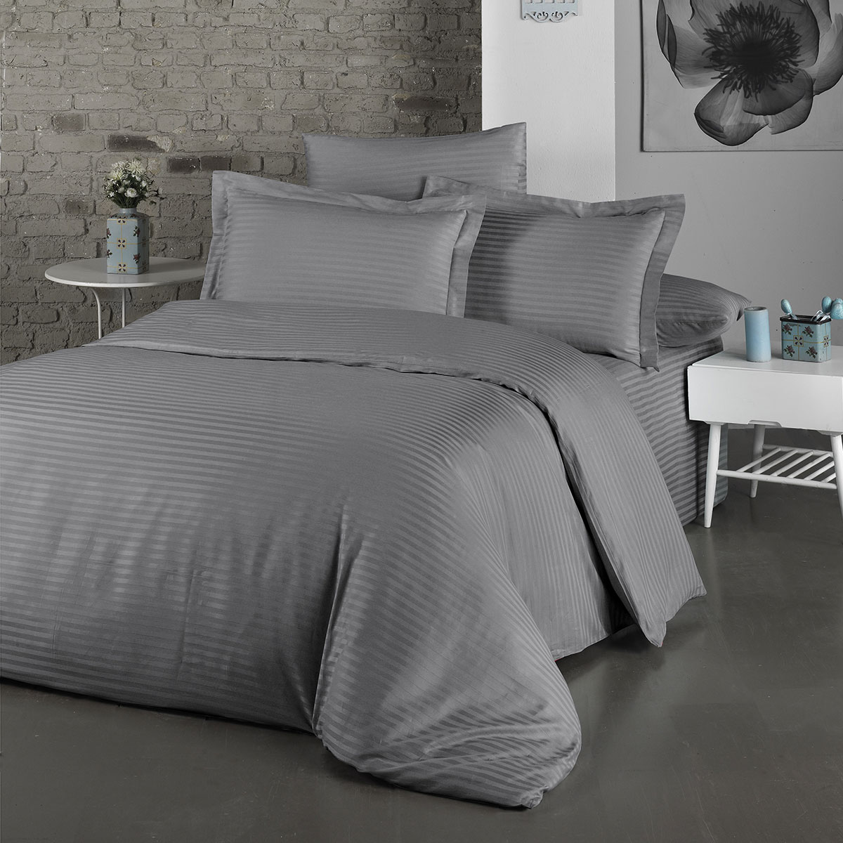 Постельное белье сатин страйп с простыней на резинке в подарочной упаковке - Мокрый асфальт