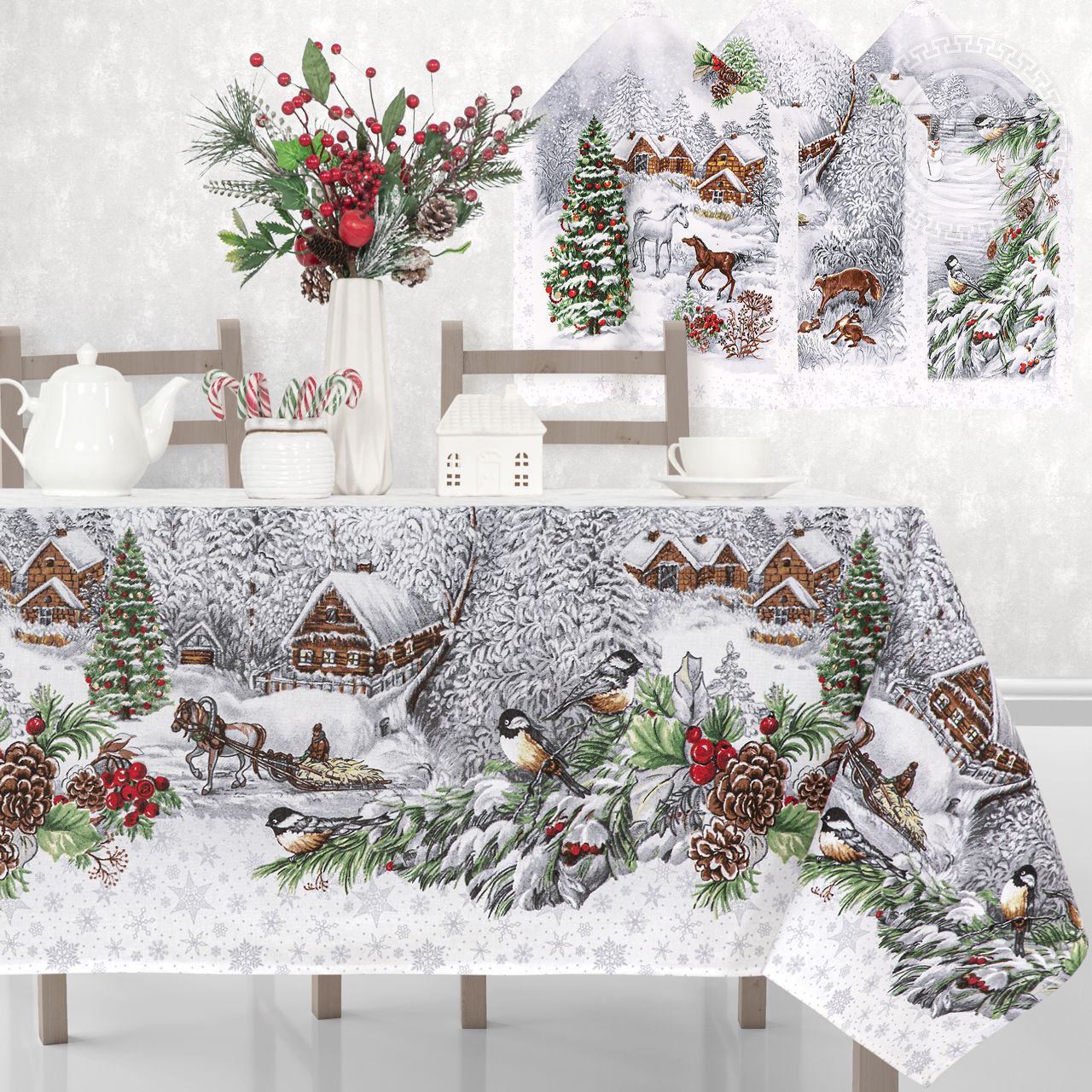 В набор входят: скатерть (1 шт) и полотенца, размер 45*60 см (3 шт)