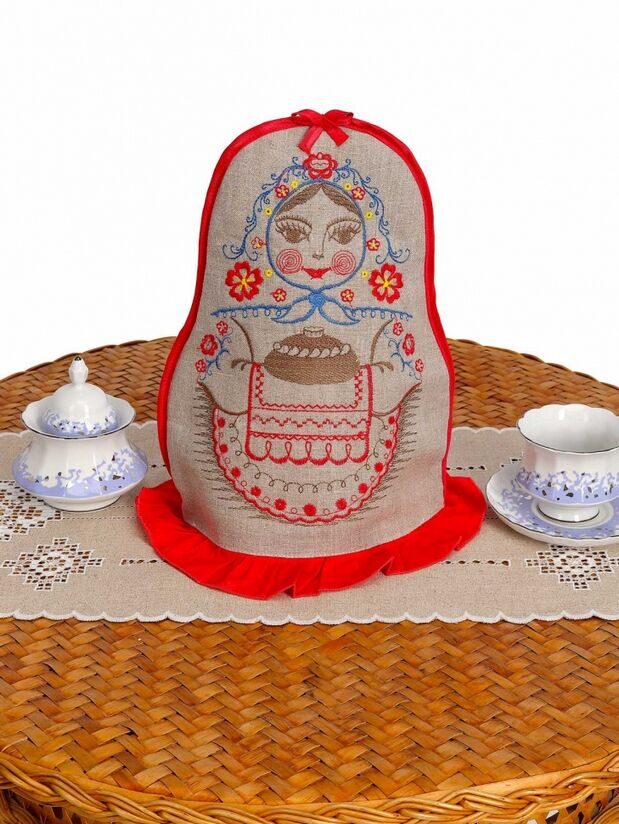 Чайница -грелка с вышивкой "Матрешка" Лен 100% Наполнитель- натуральный ватин.