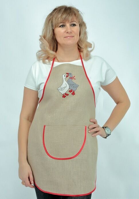 Льняной кухонный фартук-сувенир модель ЛП 34 "Гуси" с вышивкой. Лен 100%